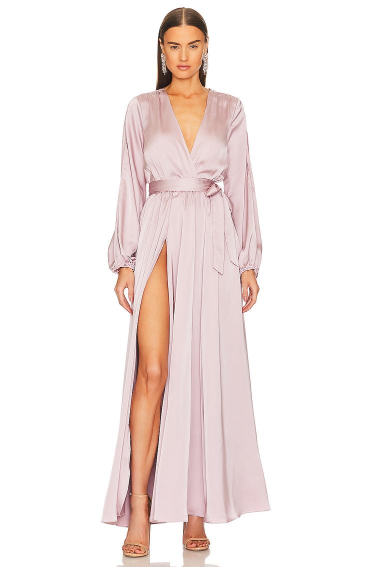 Soft shimmer satin in a dusty rose hue elevates this flowing wrap dress, featuring a surplice neckline and long blouson sleeves with elastic cuffs. The maxi-length skirt with a side slit adds graceful movement while a tie waist accentuates the silhouette. Fully lined for comfort, this gown blends elegance with modern sophistication, ideal for cocktail parties, semi-formal events, and formal occasions throughout spring to autumn.