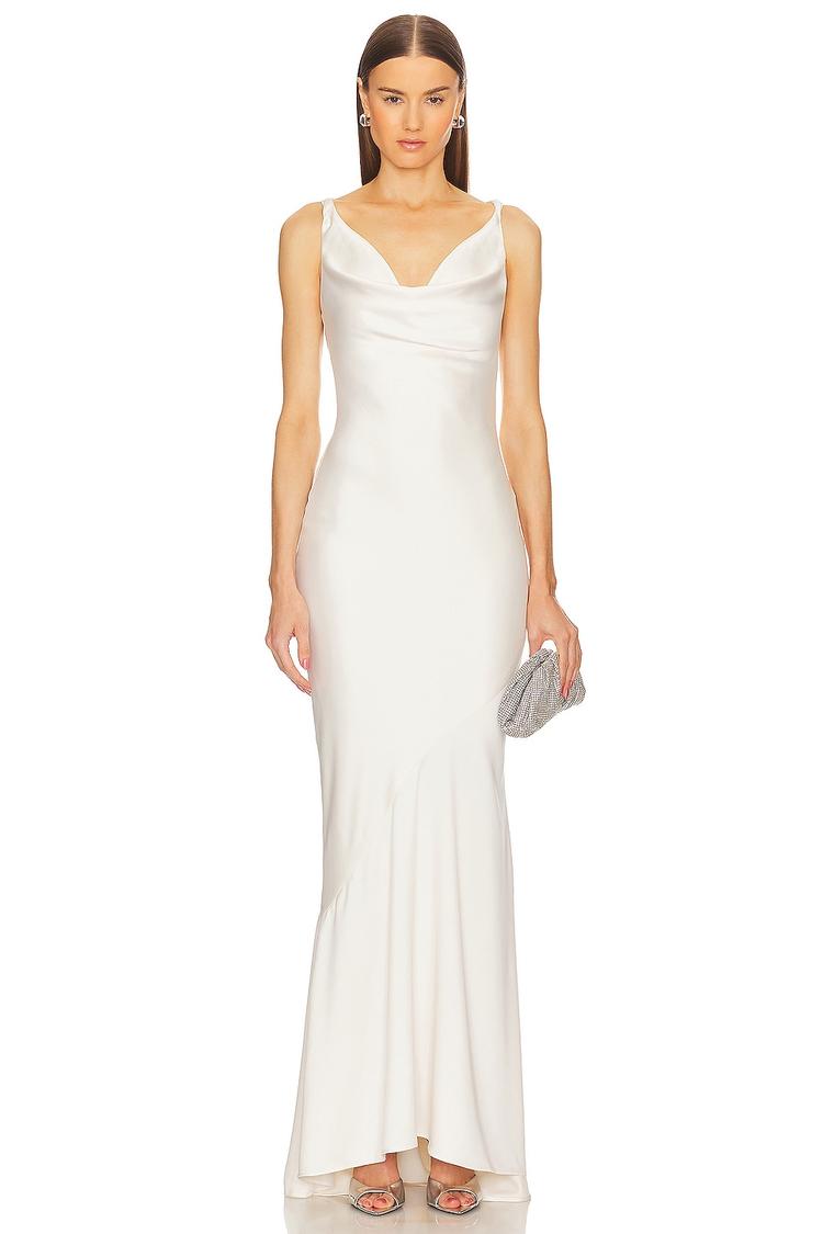 Lustrous ivory satin and a figure-hugging column silhouette define this exquisite gown, perfect for formal galas and elegant weddings. The cowl neckline gracefully drapes across the bust, complemented by a sleeveless design and a sultry open back with delicate tie and hook closures. Crafted from smooth satin fabric, the gown features subtle front draping that adds a refined texture to its clean maxi hemline. Its classic elegance and fitted shape make it an ideal choice for timeless evening events and sophisticated celebrations.