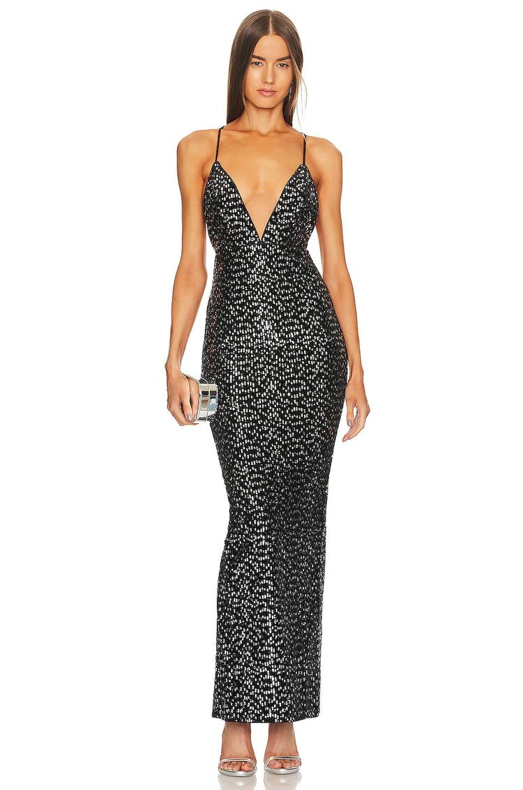 A sleek column silhouette in a shimmering black sequined velvet creates a striking evening look. The maxi length and fitted cut emphasize an elegant figure, complemented by a plunging neckline with nude mesh for subtle allure. Adjustable criss-cross spaghetti straps highlight the open back, adding sophistication and sexiness to the gown. Perfect for cocktail parties, formal galas, or upscale events, this gown combines midweight velvet comfort with radiant sequins for a stunning presence all year round.