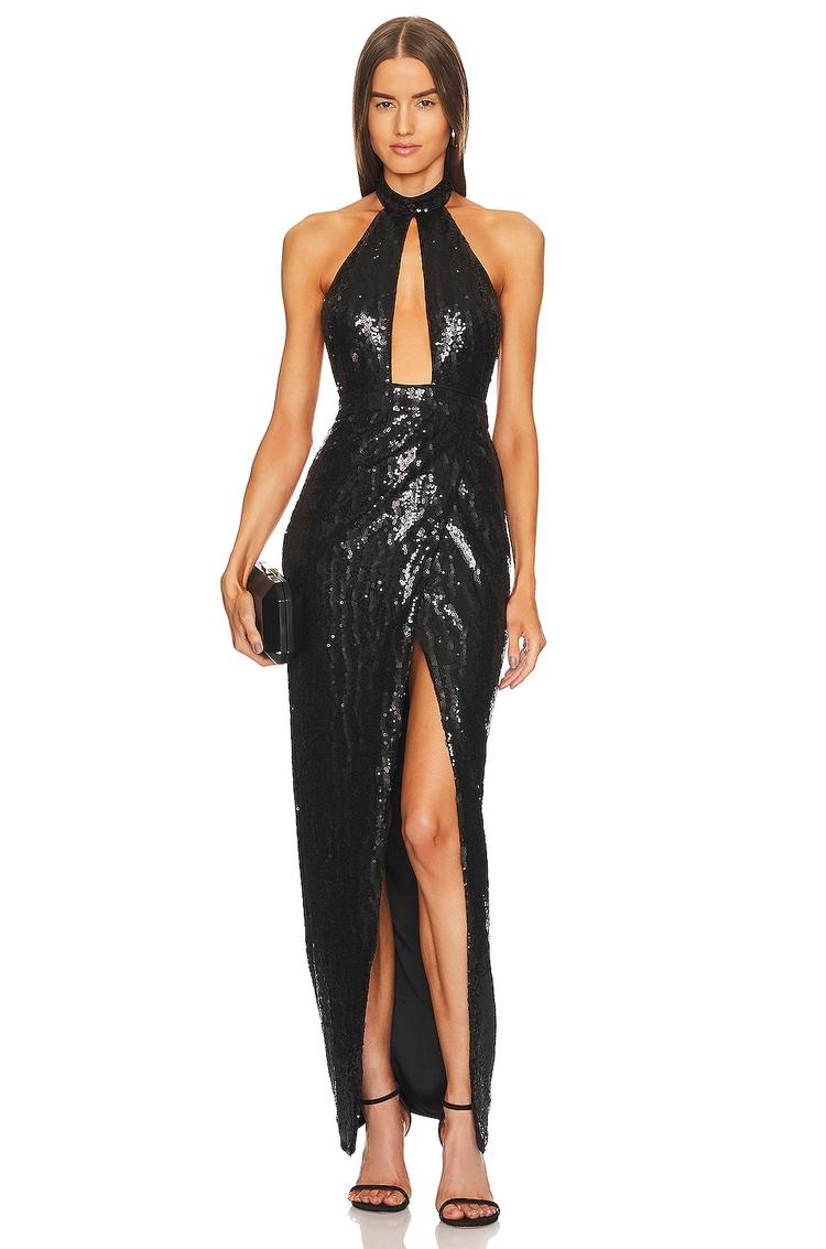 A sleek black column gown adorned with shimmering sequins offers a captivating silhouette perfect for glamorous evenings. The fitted design and halter neckline accentuate the shoulders, while the open back and thigh-high side slit add a daring touch. Crafted from midweight polyester mesh with elastane for subtle stretch, this maxi-length dress flows elegantly to the floor. Ideal for formal events, cocktail parties, and galas, it combines sophisticated style with a hint of sensuality for unforgettable night outs and date nights.