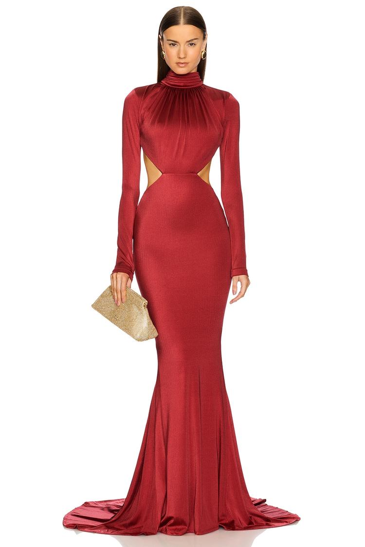 A striking matte red column silhouette with a fitted shape and long sleeves, this gown features a sophisticated mock neck and daring side and back cut-outs that add a bold edge. Crafted from a midweight tricot blend of nylon, elastane, and polyester, it offers both stretch and structure. The maxi length with a clean hemline enhances its elegant flow, making it an ideal choice for cocktail parties, formal events, or gala evenings. This gown blends classic elegance with modern sexiness for standout evening wear.