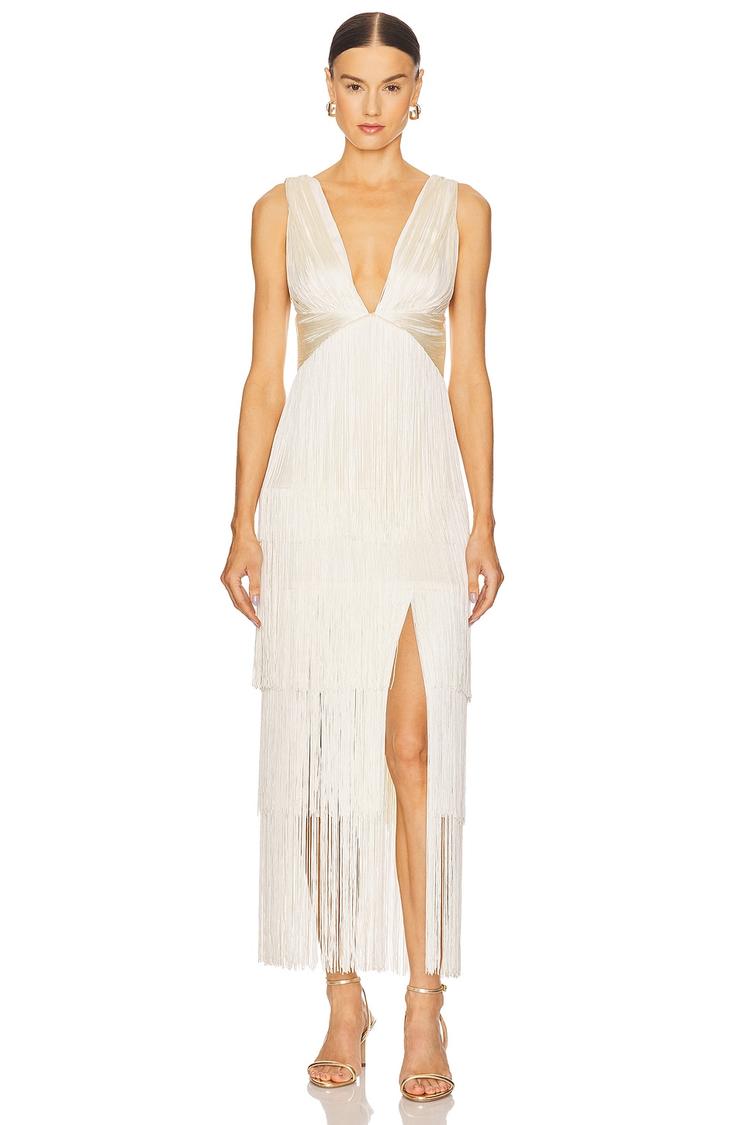 Ethereal cream viscose brings a flowing, tiered fringe maxi dress to life with a figure-hugging column silhouette. The deep neckline and sleeveless wide straps enhance its modern, sexy appeal, while a hidden back zipper and adjustable tie-back ensure a perfect fit. A high slit complements the elegant fringed hemline, making this dress ideal for cocktail parties, formal events, or a sophisticated night out. Fully lined for comfort and style, it seamlessly blends contemporary design with classic elegance.