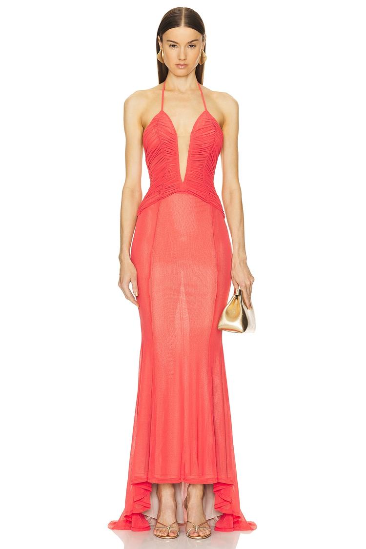 A matte coral column gown featuring a plunging halter neck and ruched bodice that sculpts a fitted silhouette. The maxi length flows gracefully with a clean hemline, perfect for spring and summer evenings. Mesh lining at the neckline adds an alluring sheer detail, while the tie-back and hidden zipper closure ensure a sleek, secure fit. This elegant and sophisticated gown is ideal for cocktail parties, date nights, and night outs, combining modern sensuality with refined style.