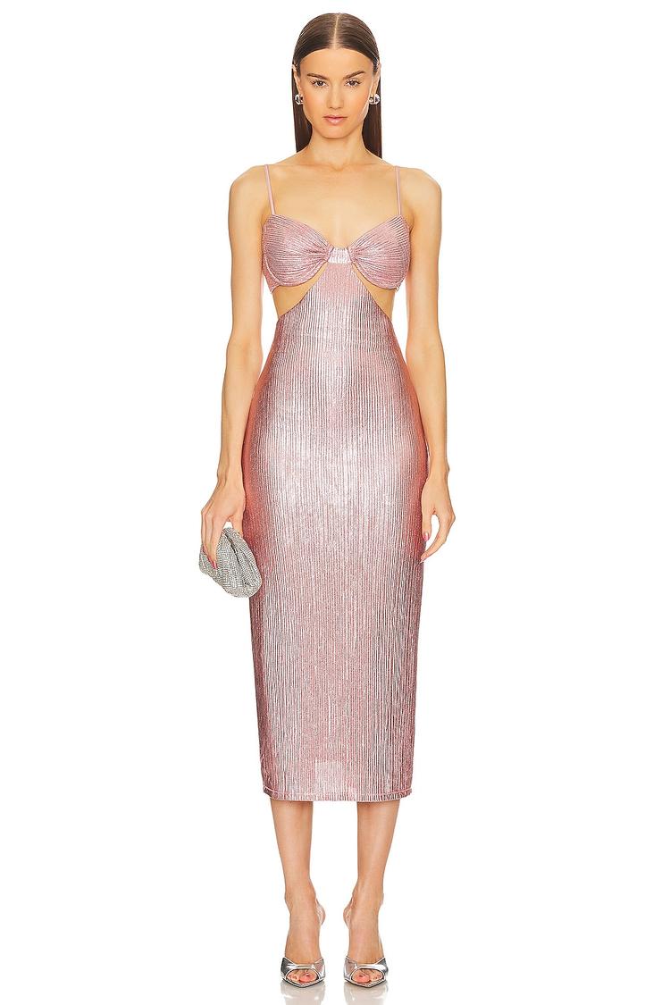 Shimmering in dusty rose plisse fabric, this fitted column midi dress sculpts the figure with striking side cutouts and an underwire bust for added support. The straight neckline and strapless styling balance the bare-all open back, while a subtle slit enhances movement. Finished with a concealed back zipper and hook closure, this glamorous piece is perfect for cocktail parties, date nights, or sophisticated evening events. Made from a comfortable polyester-spandex blend, it promises both style and ease for all-weather wear.