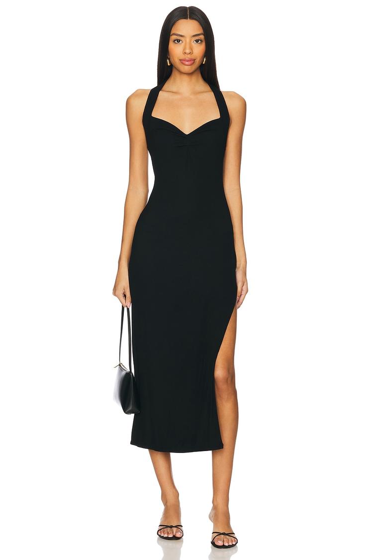 A sleek matte black maxi crafted from midweight ribbed viscose jersey offers an elegant bodycon fit that contours the silhouette. The dress features a romantic sweetheart neckline and delicate spaghetti straps that enhance its minimalist yet sexy vibe. A daring side slit adds movement and allure to the clean hemline, perfect for evening occasions. Designed for versatile wear, this pull-on slip dress suits date nights, cocktail parties, and nights out, blending comfort with sophisticated style effortlessly.