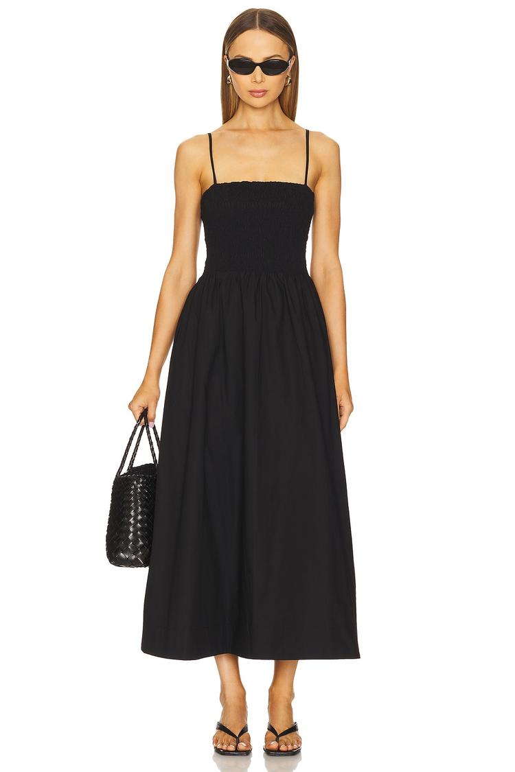 Soft cotton poplin and a flowing midi hem combine to create a versatile A-Line silhouette with a straight neckline and adjustable spaghetti straps. The cinched elastic bodice offers an adjustable fit, complemented by a delicate tie-back closure for added style and comfort. This matte black dress is perfect for casual brunches, sunny vacations, and laid-back spring or summer days. Its minimalist design and breathable fabric make it an effortless choice for warm weather, blending comfort with understated chic.