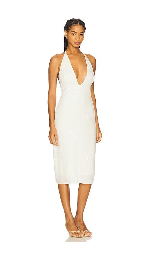 MILKWHITE X REVOLVE MIDI DRESS WITH V NECKLINE IN WHITE.