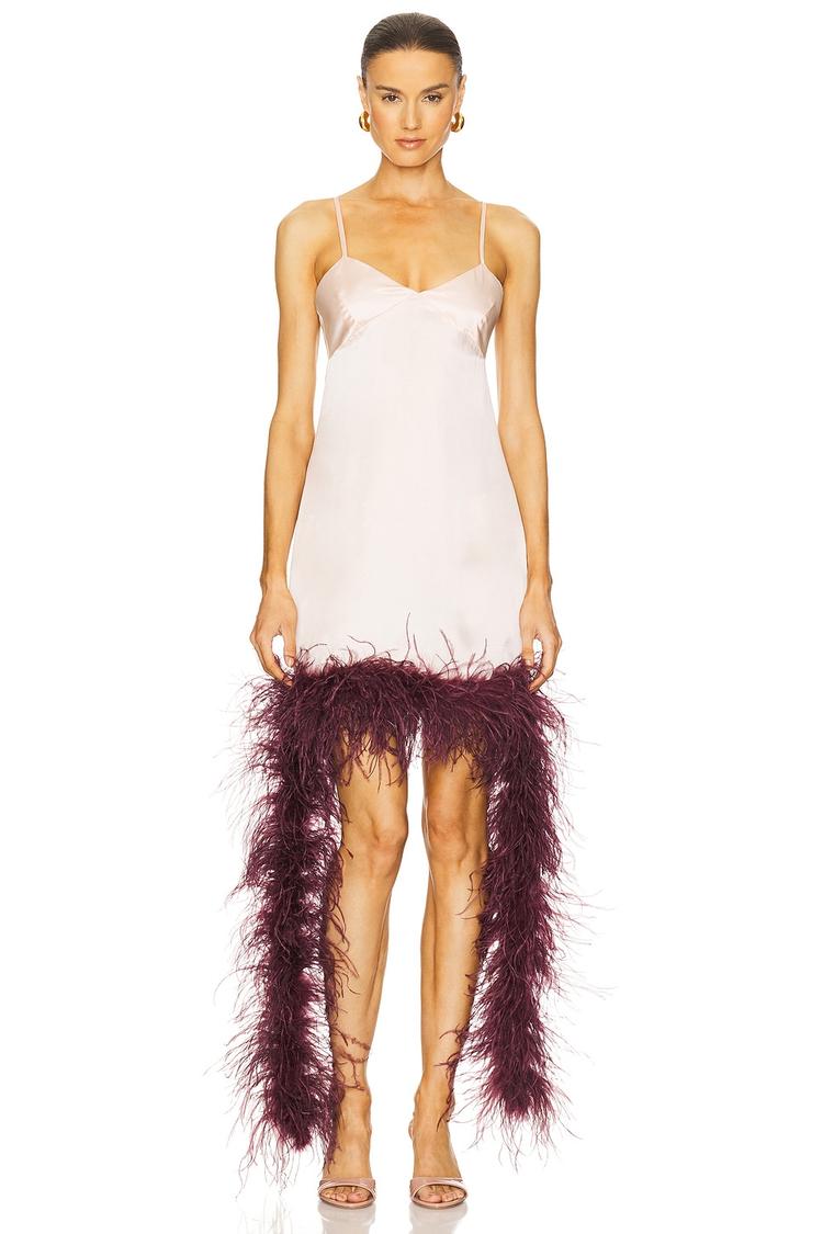 Soft silk fabric with a figure-flattering slip silhouette and a flirty mini length combines with a romantic sweetheart neckline and delicate spaghetti straps for a sexy, modern look. Draped ostrich feather details in rich burgundy cascade elegantly from the sides and hem, adding luxe texture and movement. This blush mini dress is perfect for cocktail parties, date nights, and stylish evening occasions during spring and summer, offering adjustable straps for a tailored fit and a hidden back zipper for sleek closure.