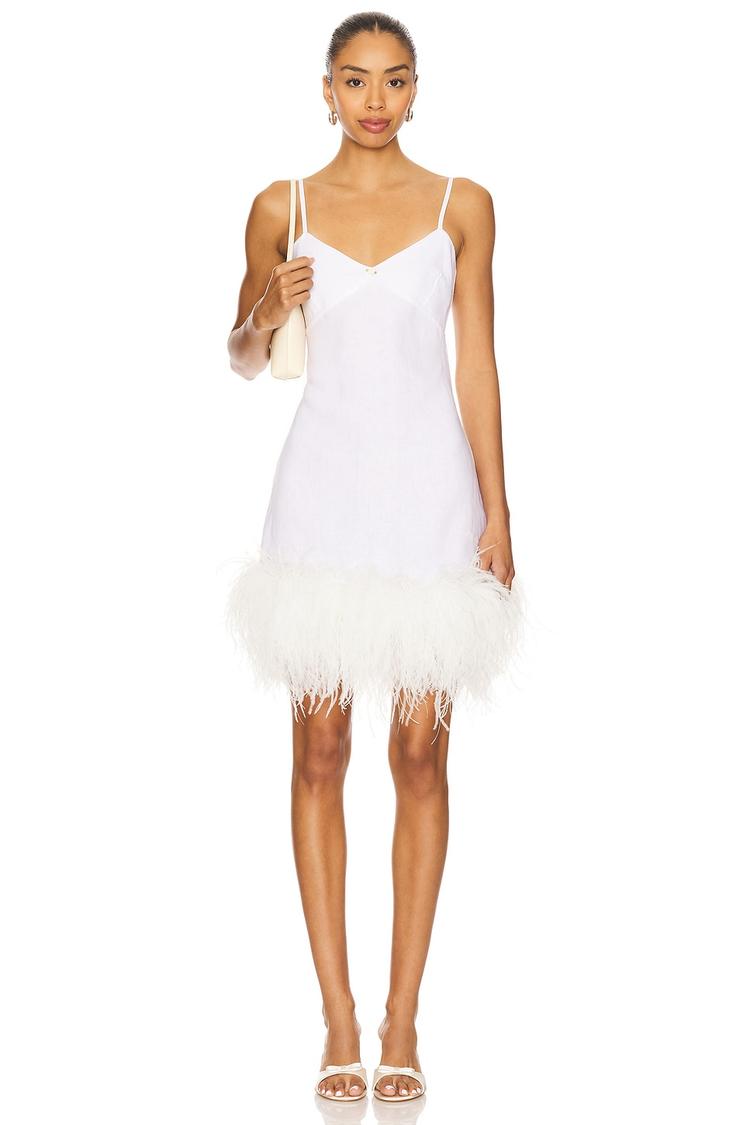 Soft linen fabric complements the sleek silhouette of this mini slip dress, featuring a flattering V-neckline and slender adjustable spaghetti straps. The dress is enhanced by a playful feather trim along the hem, adding a chic and elegant touch. A concealed back zipper ensures a smooth finish, while the slim fit contours the body gracefully. Ideal for cocktail parties, date nights, and stylish evening outings during spring and summer, this versatile piece combines minimalist design with standout detail for effortless sophistication.