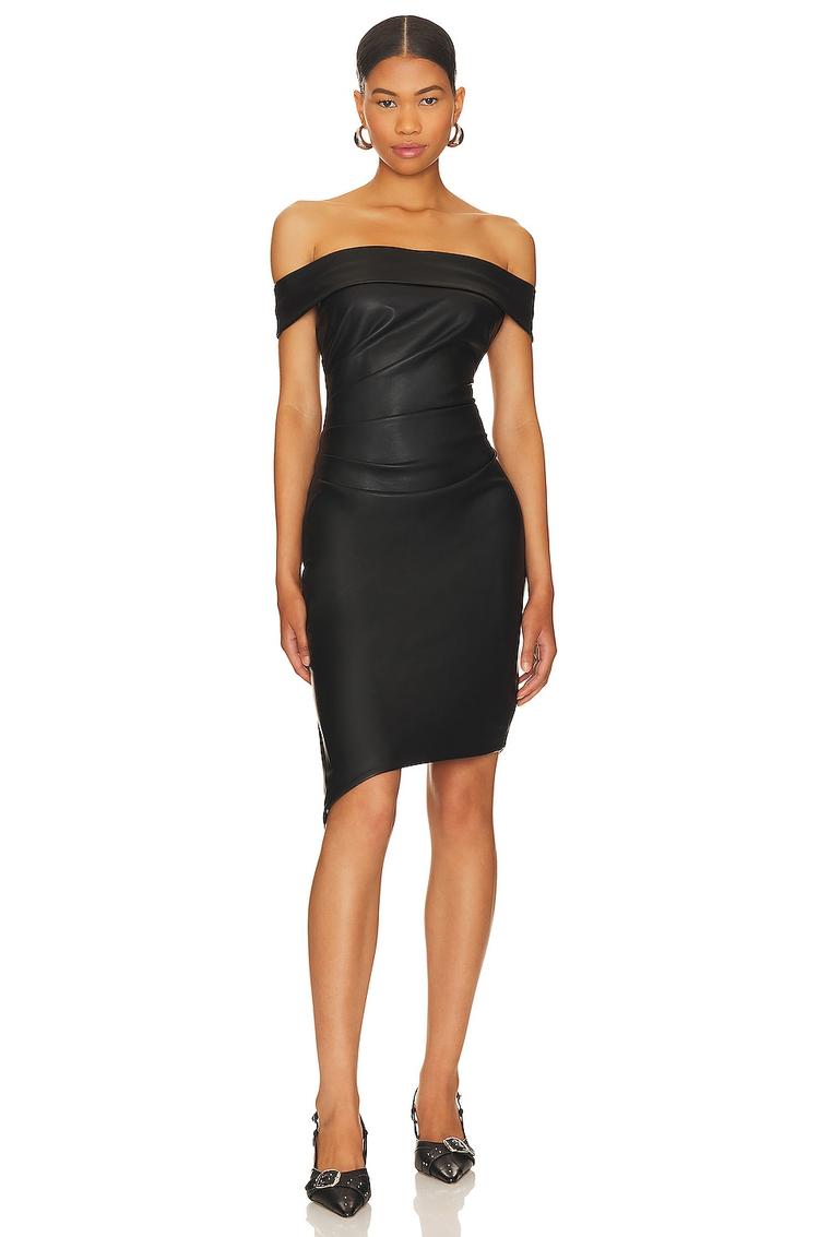 A sleek matte black sheath dress crafted from faux leather delivers a fitted, body-skimming silhouette with an alluring off-shoulder foldover neckline. The asymmetric hem adds a modern edge, complemented by a hidden side zipper closure for a smooth finish. Fully lined with stretch polyester-elastane blend, this midi-length piece is perfect for sophisticated date nights, cocktail parties, or chic night outs. Its versatile style and contemporary design make it a statement piece for the confident wearer.