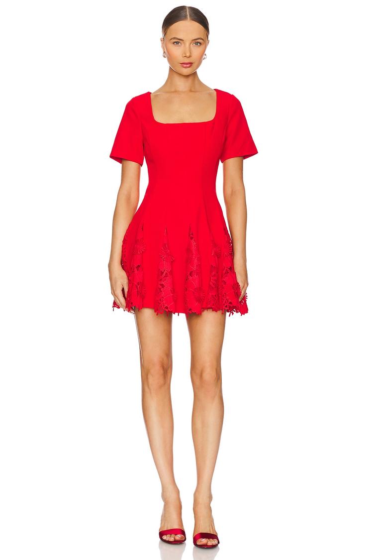 A vibrant red mini dress features a flattering fit and flare silhouette with a chic square neckline and half sleeves. Crafted from midweight crepe polyester with a hint of elastane for comfort, it offers a concealed back zipper and a fully lined bodice. The pleated skirt showcases elegant lace floral cut-outs adding a delicate texture and feminine flair. This versatile piece is ideal for spring and summer occasions such as brunches, date nights, and cocktail parties, combining classic elegance with modern charm.