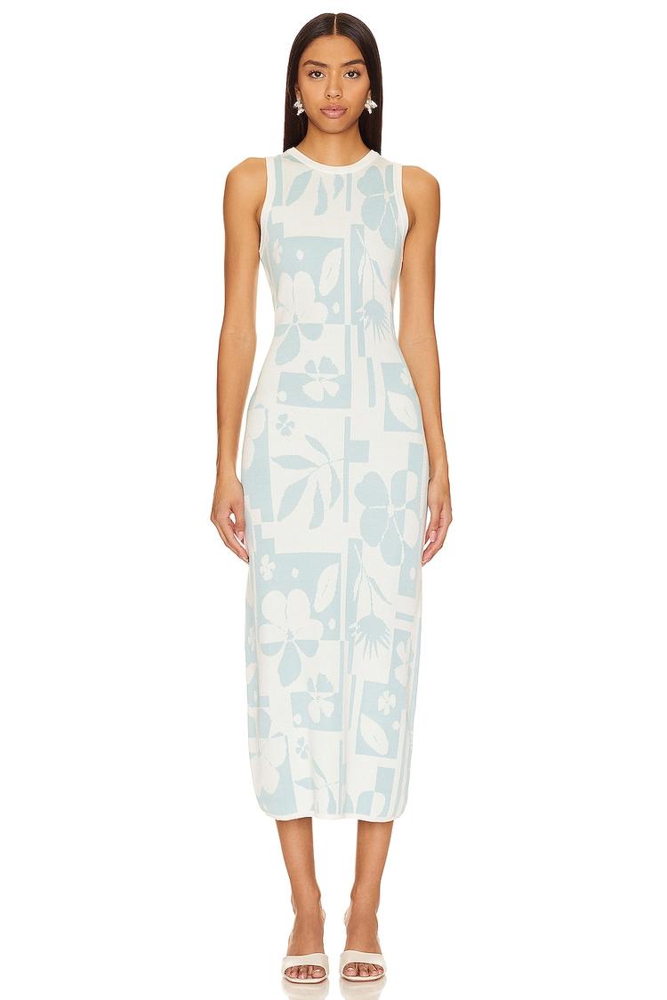 Soft lyocell fabric and a fitted sheath silhouette combine in this midi dress, featuring a subtle floral pattern in light blue over a crisp white base. The sleeveless design with wide straps and a round neckline offers clean, minimalist lines, while ribbed trim adds a touch of texture. Ideal for spring and summer, this versatile piece works beautifully for casual outings, brunch dates, or relaxed evenings. Its pull-on slip-on styling ensures easy wear without compromising on style or comfort.