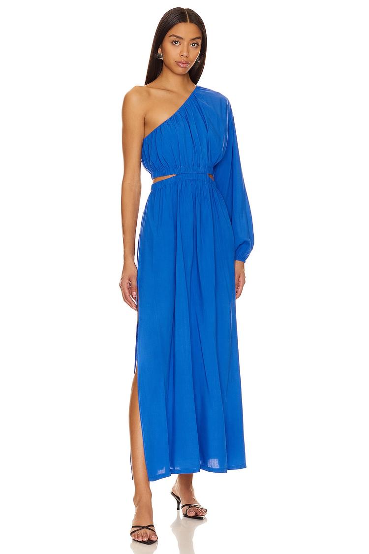 A striking matte blue shift dress features an asymmetric neckline and a single long sleeve with a cinched cuff, creating a modern silhouette with side cut-outs that highlight a lightweight viscose fabric. The elastic waistband and side slit add comfort and movement, perfect for spring and summer brunches, date nights, or cocktail events. Its elegant and sophisticated style is enhanced by subtle ruffles on the sleeve, making it a versatile choice for various occasions where effortless chic is desired.