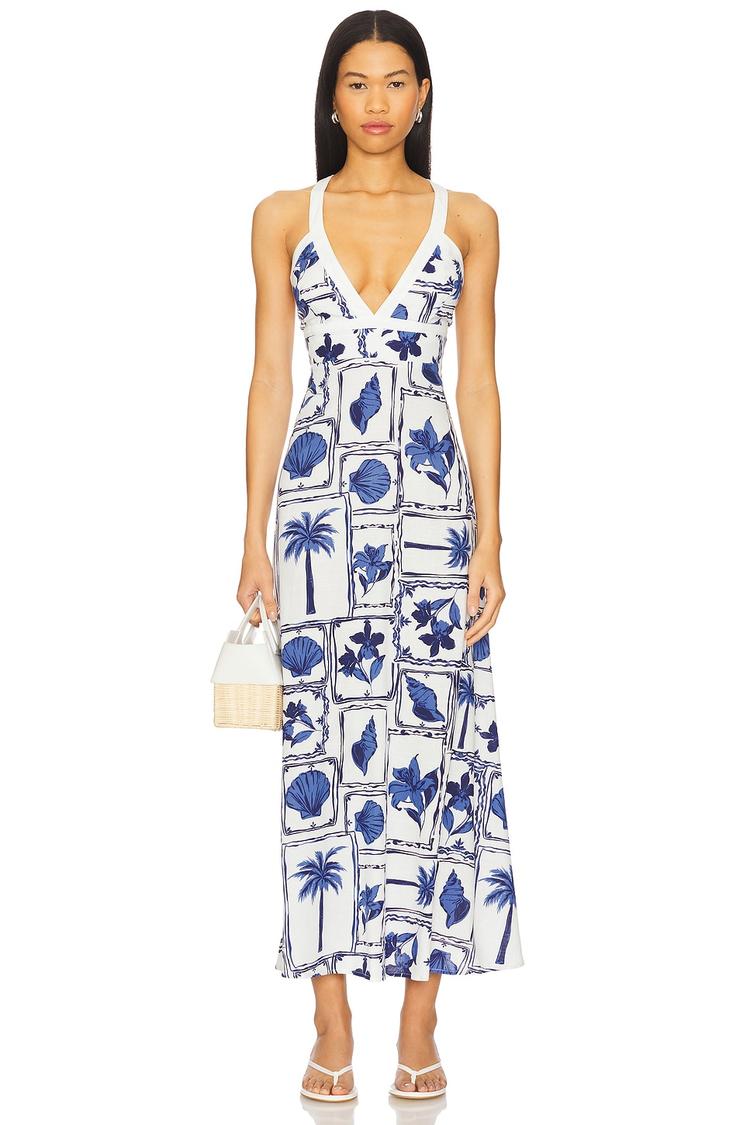 Sunlit days call for this breezy slip dress featuring a botanical print in crisp blue and white. Crafted from a midweight linen blend, it offers a flowy fit with a flattering V-neckline and slender spaghetti straps that cross at the back. The midi length and concealed back zipper provide an effortless silhouette perfect for brunches, beach outings, or relaxed vacation days. Adjustable straps add comfort and versatility to this casual chic piece that combines natural fabrics with easy style.