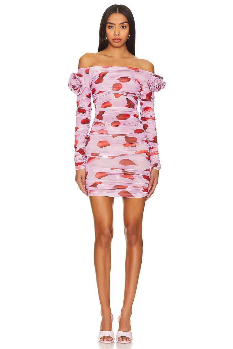 Soft pink viscose blends with a touch of elastane create a figure-hugging mini dress featuring off-shoulder neckline and long sleeves. The dress is adorned with rosette appliqués at the sleeves and ruched detailing throughout, adding texture and a sexy silhouette. A hidden side zipper ensures a sleek fit, while the abstract red pattern pops vibrantly against the pink base. Ideal for spring and summer nights, this trendy piece works perfectly for date nights, cocktail events, and girls' nights out, combining comfort with standout style in one chic package.