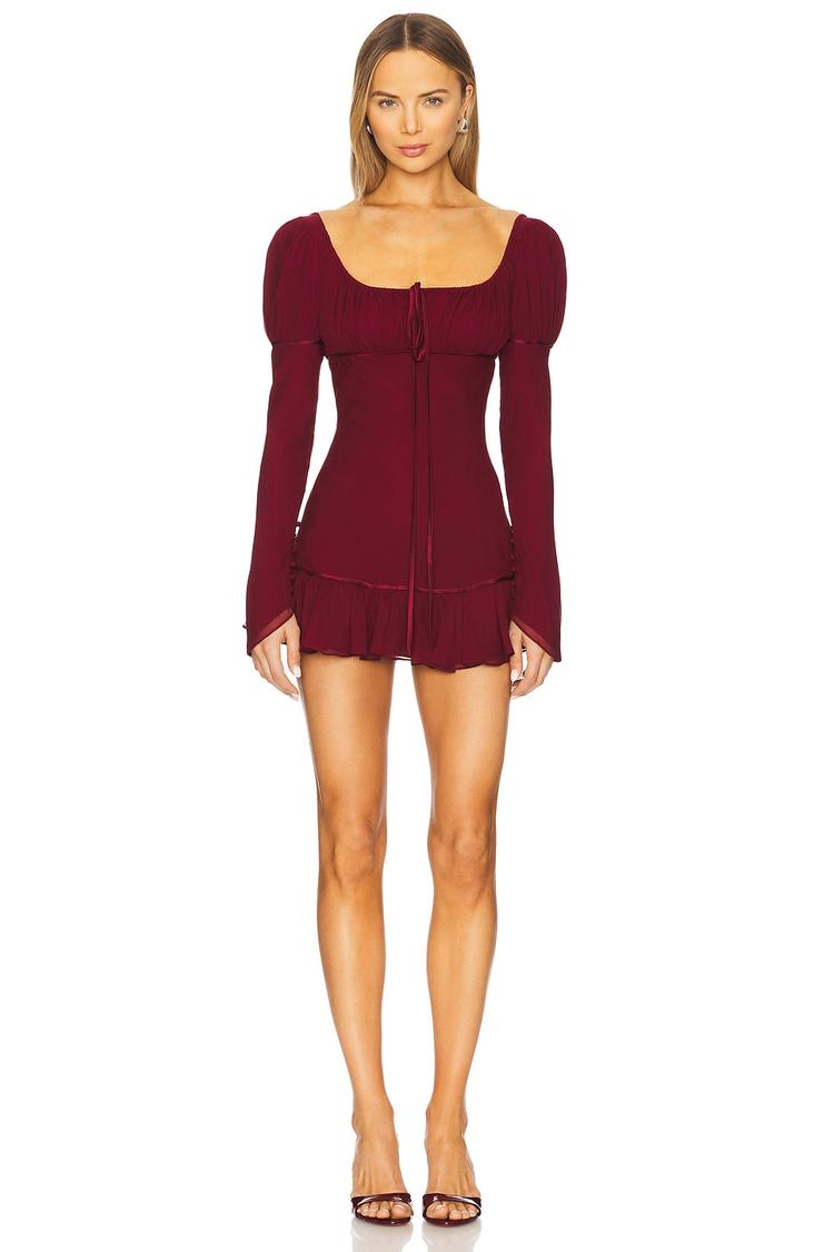 Rich matte burgundy silk crepe shapes a fitted mini shift dress with a flattering square neckline and dramatic puffed long sleeves. The hidden back zip and hook closure ensure a sleek silhouette, while the ruffled hem adds a playful feminine touch. Fully lined for comfort, this sophisticated piece transitions seamlessly from cocktail parties to night outs and date nights. Crafted in the USA, its elegant design and luxe fabric make it a must-have for any refined wardrobe.