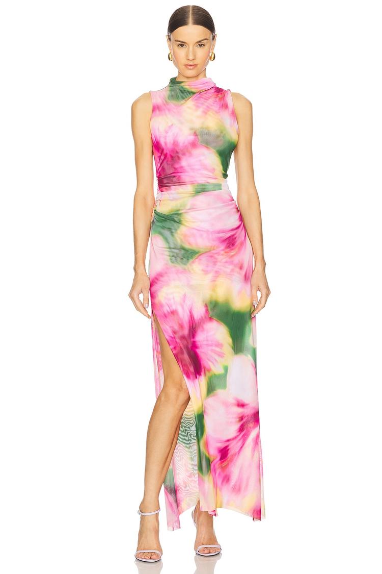 A vibrant floral print on midweight mesh fabric defines this fitted sheath dress, featuring a high neckline and sleeveless cut for warm weather elegance. The maxi length with a side slit and cinched sides enhances its sleek silhouette, perfect for spring and summer occasions. Button loop closures at the shoulders add a delicate detail, while the fully lined polyester-spandex blend offers comfort and stretch. Ideal for cocktail parties, date nights, or stylish evening outings, this dress blends modern chic with effortless sophistication.