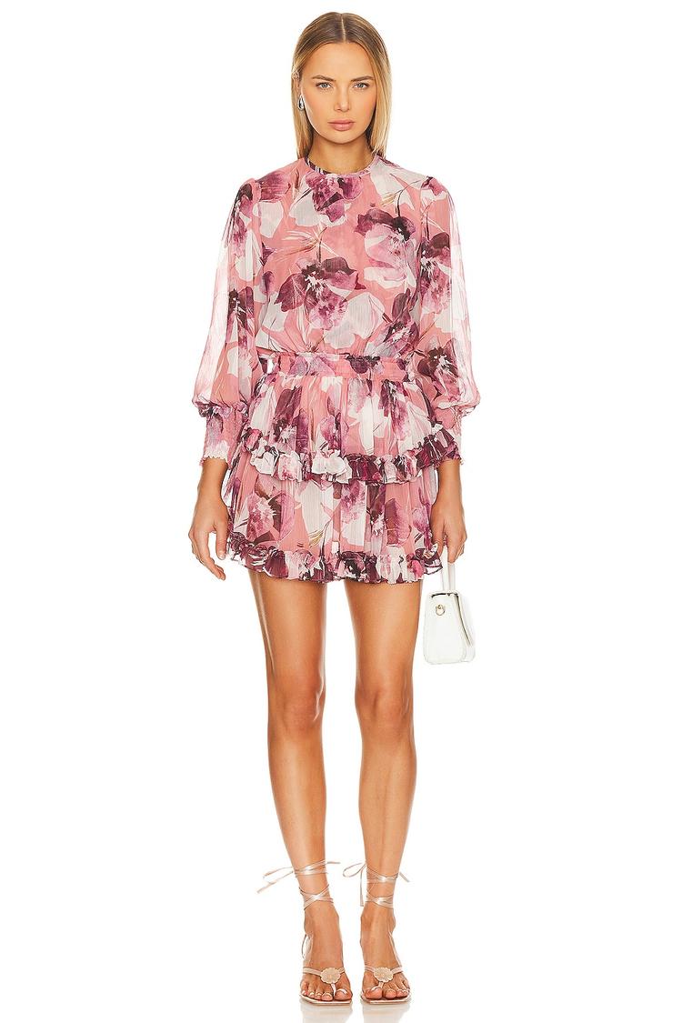 Soft voile fabric and romantic floral print blend effortlessly in this mini shift dress featuring a relaxed fit and a smocked waistband that defines the silhouette. The round neckline pairs beautifully with three-quarter blouson sleeves finished with smocked cuffs, while delicate ruffles accent the hem, skirt, and sleeves for added texture. Ideal for spring and summer occasions, this lightweight dress suits brunch outings, date nights, and cocktail events with ease.