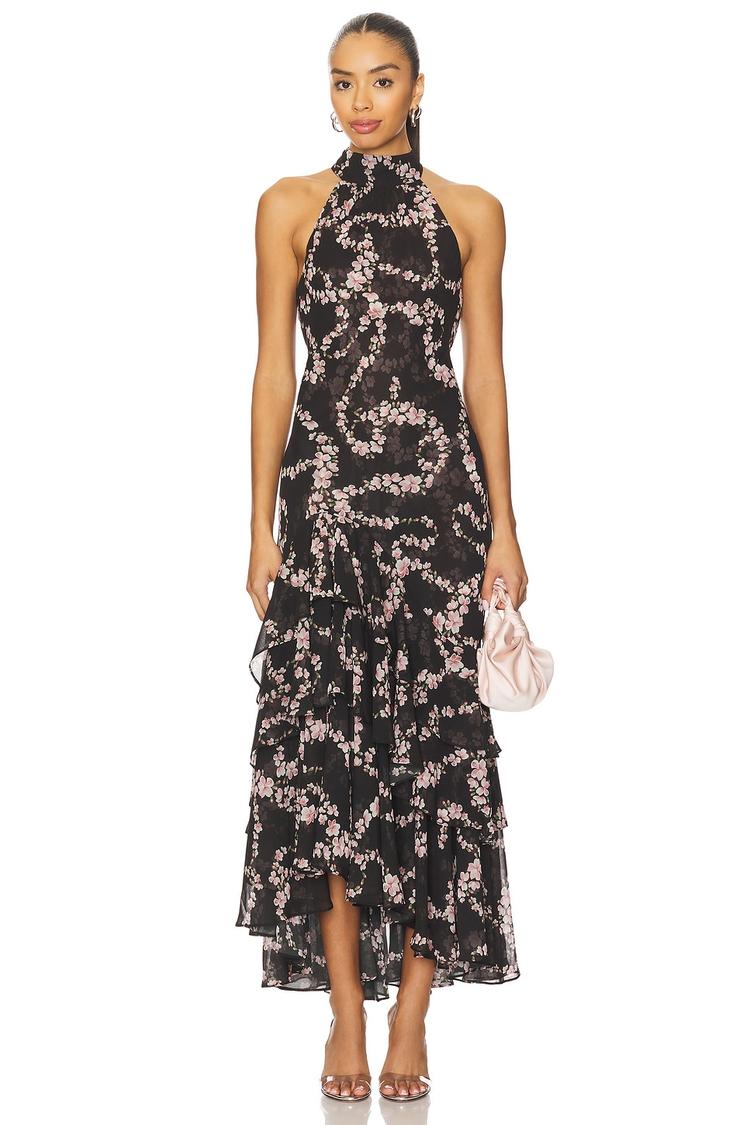 Soft midweight mesh fabric shapes this elegant A-Line midi dress featuring a romantic halter neckline and sleeveless silhouette. The flowy fit is enhanced by layered ruffle details at the hem, while blush floral patterns contrast beautifully against the black base. A button closure at the tie-back completes the look, making it perfect for brunch, cocktail events, or a date night. Unlined and designed for professional dry cleaning, this dress offers both style and comfort for spring through autumn wear.