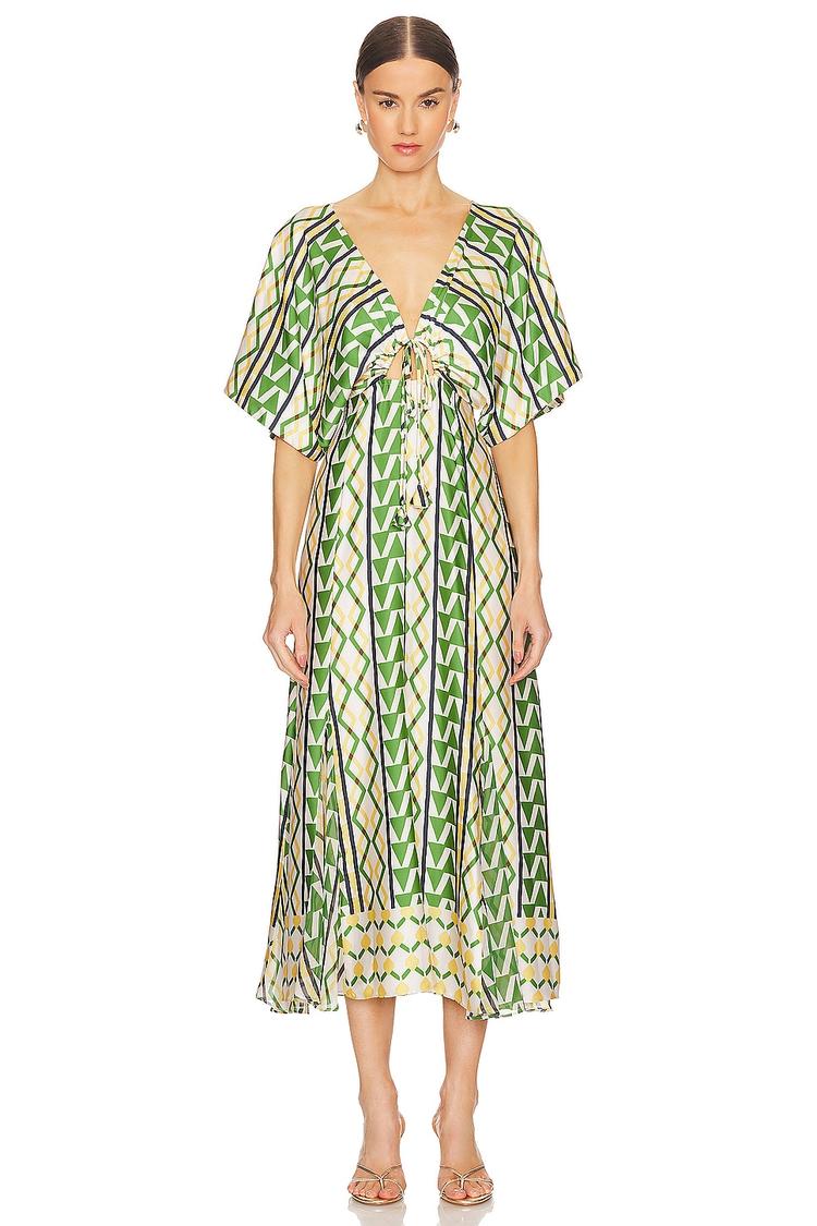 Soft satin fabric paired with delicate chiffon hem panels creates a graceful flow in this elegant A-Line midi dress. The deep V-neck and elbow-length wide sleeves complement the relaxed, flowy fit, enhanced by a front keyhole drawstring for subtle detailing. Featuring a concealed back zipper, this piece shines with its abstract green and black pattern on a cream base, perfect for spring and summer occasions. Ideal for brunch, cocktail events, or romantic date nights, this dress brings effortless sophistication to your wardrobe.