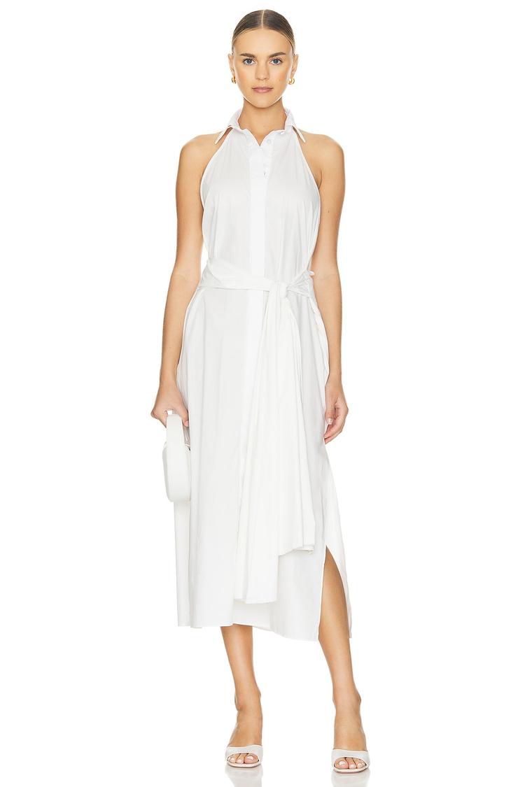 Clean lines and a sleek halterneck define this white midi dress, crafted from a comfortable cotton blend with a hint of stretch. The open back and sleeveless design add a modern, minimalist edge, while the side slit enhances movement and ease. Featuring a front button closure and functional side seam pockets, this versatile shift-wrap dress is perfect for spring and summer occasions like brunches, date nights, and beach vacations. Its elegant silhouette and breathable fabric make it an effortlessly stylish choice for outdoor events and cocktail gatherings.