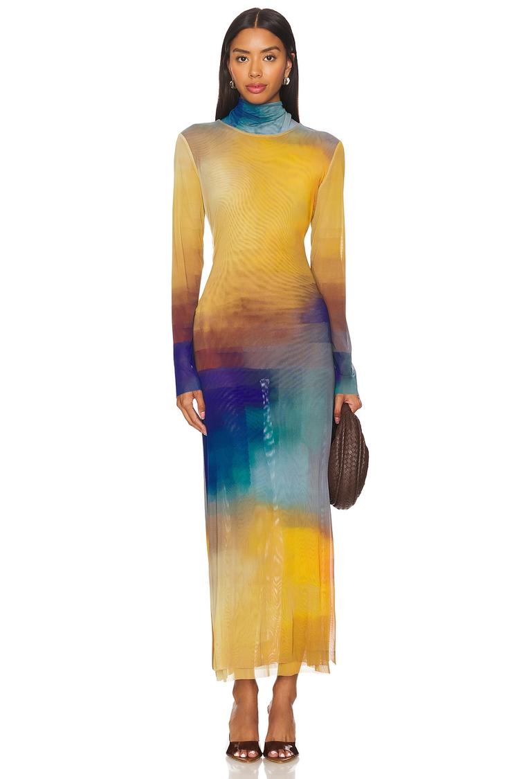 Soft mesh fabric with a hint of stretch sculpts a slender column silhouette in this elegant maxi dress. The high neckline and long sleeves balance the body-hugging fit, while the abstract color-block pattern transitions from vibrant yellow to deep blue and purple hues, creating a modern, chic look. Fully lined for comfort and easy pull-on styling make it a versatile choice for cocktail parties, date nights, or stylish evening outings. The clean hemline and sheer mesh texture add subtle sophistication to this must-have piece.