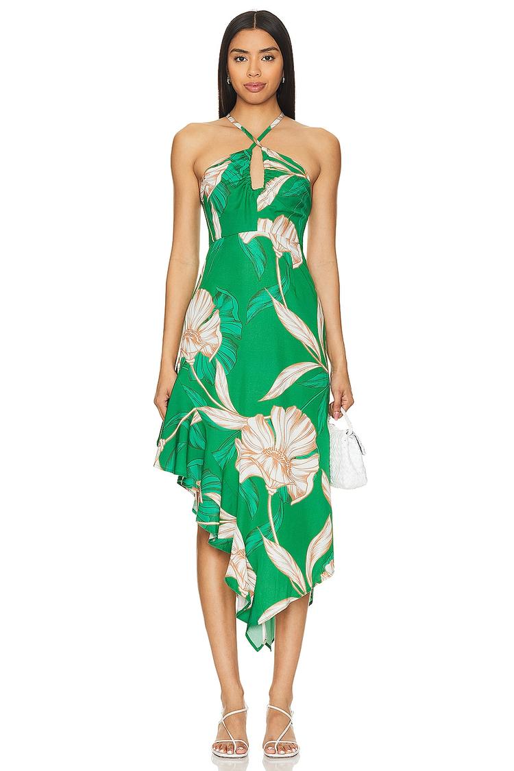 Sunlit gardens and elegant soirées come alive in this green halter neck slip dress featuring a flowing asymmetrical hem with delicate ruffle details. Crafted from lightweight viscose with a breathable cotton lining, it offers a slim fit that flatters the silhouette. The adjustable tie-back and hidden zipper ensure a perfect fit, while the all-over floral print adds a romantic bohemian touch. Ideal for brunches, cocktail parties, and vacation getaways, this dress combines comfort and style effortlessly for warm-weather occasions.