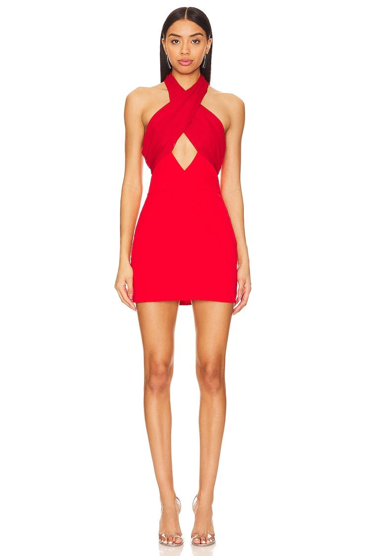 Bright red crepe fabric shapes a fitted mini sheath silhouette that exudes modern allure. The halter neckline with a striking front crisscross detail and a bold front cut-out adds a sexy edge. A concealed back zipper ensures a sleek finish, while the sleeveless and covered back design keep the look clean and chic. Perfect for spring and summer nights out, cocktail parties, or intimate date nights, this lightweight dress offers both style and effortless wearability.