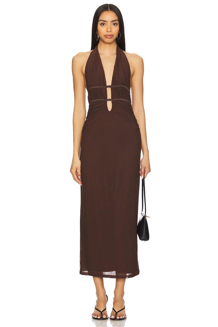 A sleek matte brown column silhouette in a fitted maxi length showcases minimalist elegance with a halter neck and strapless styling. The dress features a hidden back zipper and distinctive front double S-hook closures that add subtle allure. Crafted from midweight mesh nylon and elastane fabric, it promises comfortable stretch and a streamlined fit. Ideal for summer and spring evenings, this versatile piece works beautifully for cocktail parties, date nights, and night outs, delivering a chic and sexy vibe with clean hemline details.