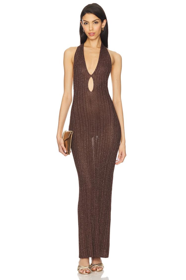 Metallic dark brown knit fabric with a shimmering finish creates a sleek, slim-fitting column silhouette that extends to a maxi length. The halter neck with a tie closure and open back design add a sexy and modern edge, while the front cut-out detail enhances its elegant allure. Crafted from a midweight viscose, nylon, and lurex blend, this intentionally sheer dress offers a daring and sophisticated look perfect for cocktail events, night outs, or date nights. The clean hemline and sleeveless styling complete this standout piece for versatile all-weather wear.