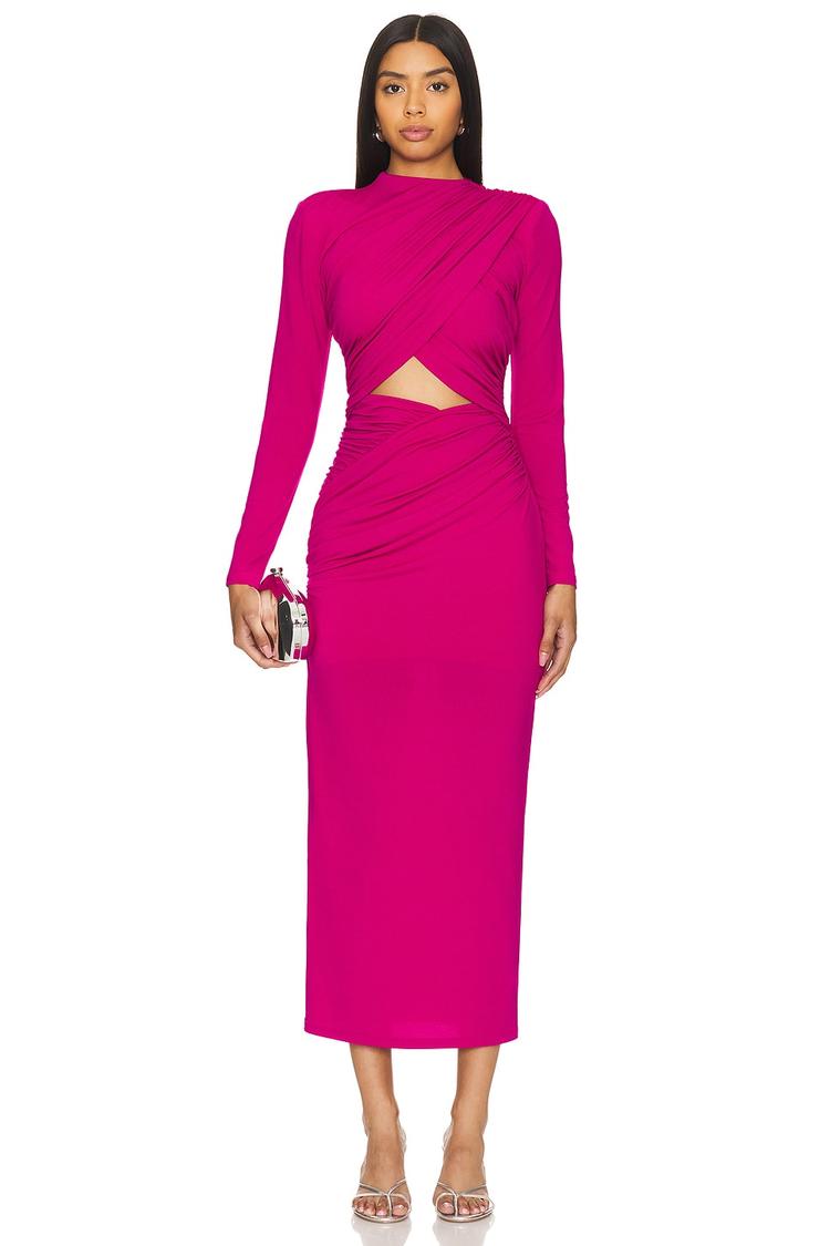 Bold and modern, this fuchsia midi sheath dress features a high neckline and long sleeves crafted from comfortable jersey fabric. The fitted silhouette is enhanced with elegant ruching across the bodice and skirt, while a daring front cut-out adds a sexy touch. The concealed back zipper ensures a sleek finish, making it perfect for cocktail parties, date nights, and evening events. Its clean hemline and sophisticated design combine comfort and style effortlessly for versatile all-weather wear.