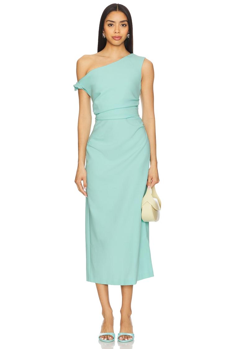 Soft matte light blue twill fabric shapes a fitted sheath silhouette that elegantly hugs the body. The midi length and asymmetric one-shoulder neckline add a modern touch, while ruched sides enhance the silhouette with subtle texture. Perfectly suited for cocktail events, date nights, and formal occasions, this dress offers sophisticated style and comfort with its stretch blend fabric and hidden side zipper closure. Transition seamlessly through spring, summer, and autumn in this refined and flattering design.
