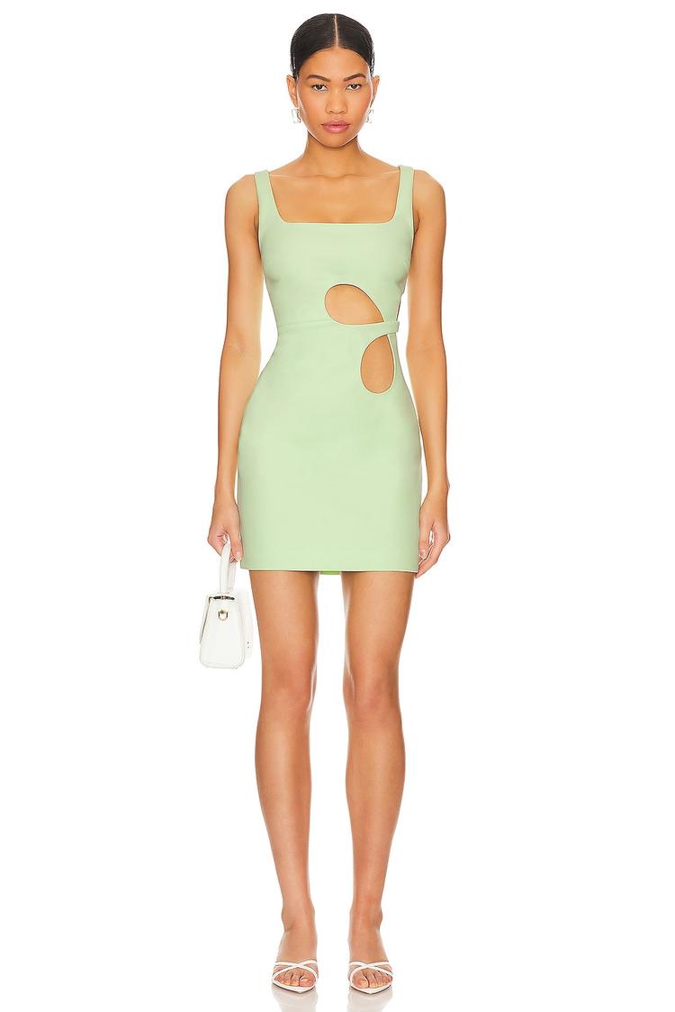 Soft matte light green crepe fabric and a fitted sheath silhouette define this chic mini dress. Featuring a flattering square neckline and sleeveless wide straps, it hugs the body with draped side cut-outs adding a modern sexy edge. The clean hemline and invisible back zipper complete the look, making it ideal for date nights, cocktail events, or a stylish night out. Perfect for spring and summer, this dress balances bold design with elegant simplicity for versatile wear.