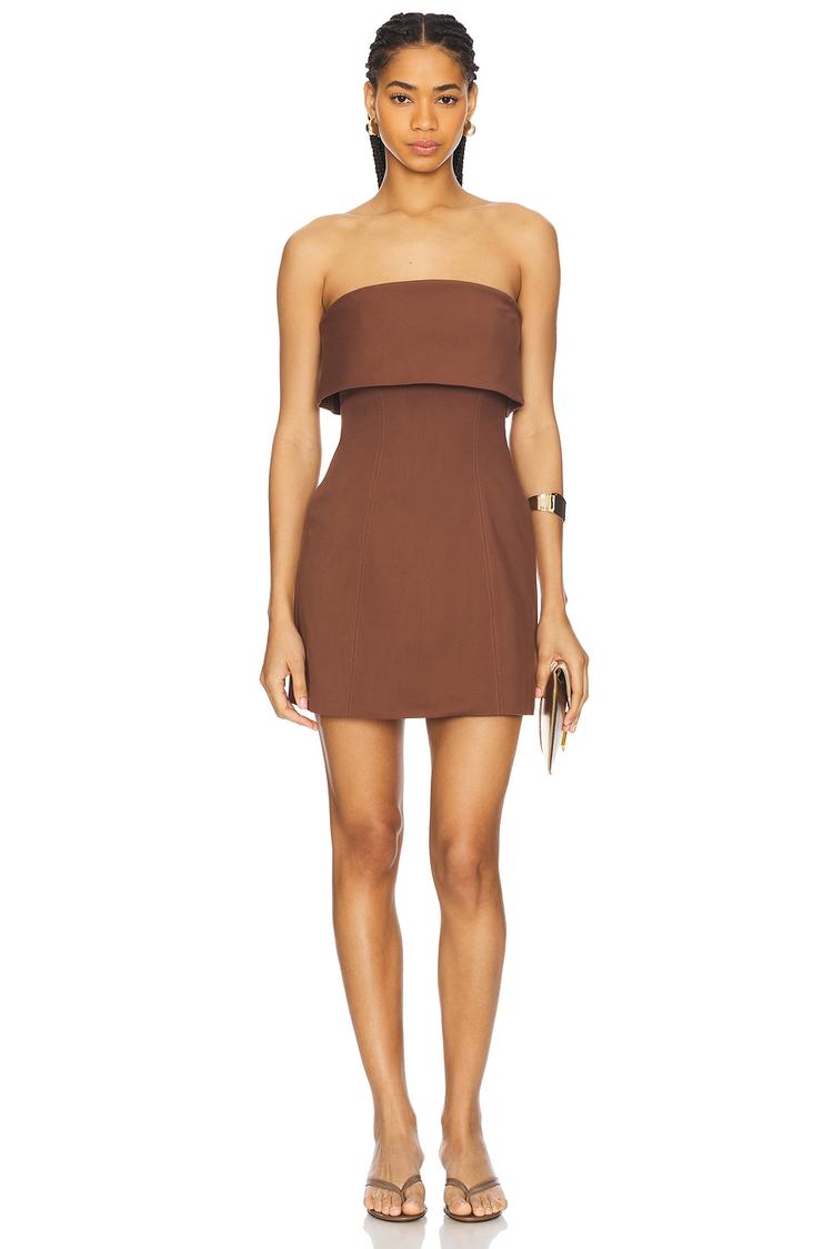A sleek silhouette and rich matte brown crepe fabric define this shift mini dress. Featuring a strapless straight neckline and a boned bodice for structured elegance, it fits closely for a flattering shape. The hidden back zipper and fully lined construction enhance comfort and finish. Versatile for all seasons, this minimalist, classic piece suits cocktail parties, night outs, and date nights with ease, combining timeless style with modern tailoring.