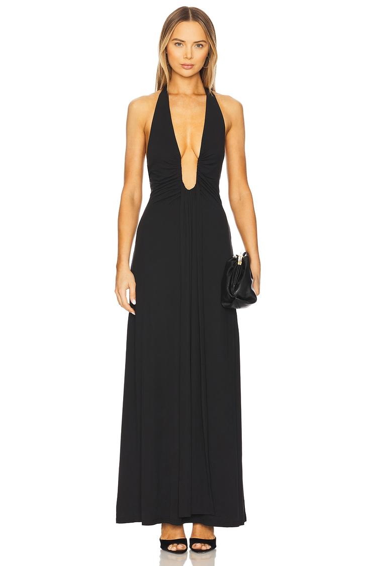 A sleek black column silhouette defines this maxi dress, featuring a plunging neckline with a U-wire accent that enhances its elegant appeal. Crafted from midweight crepe fabric with subtle draping at the front, it offers a fitted shape that flatters the figure. The halterneck and open back add a sexy, classic touch, perfect for formal events, cocktail parties, or a memorable date night. Fully lined for comfort and a smooth fit, this versatile gown combines sophistication and allure in one striking piece.