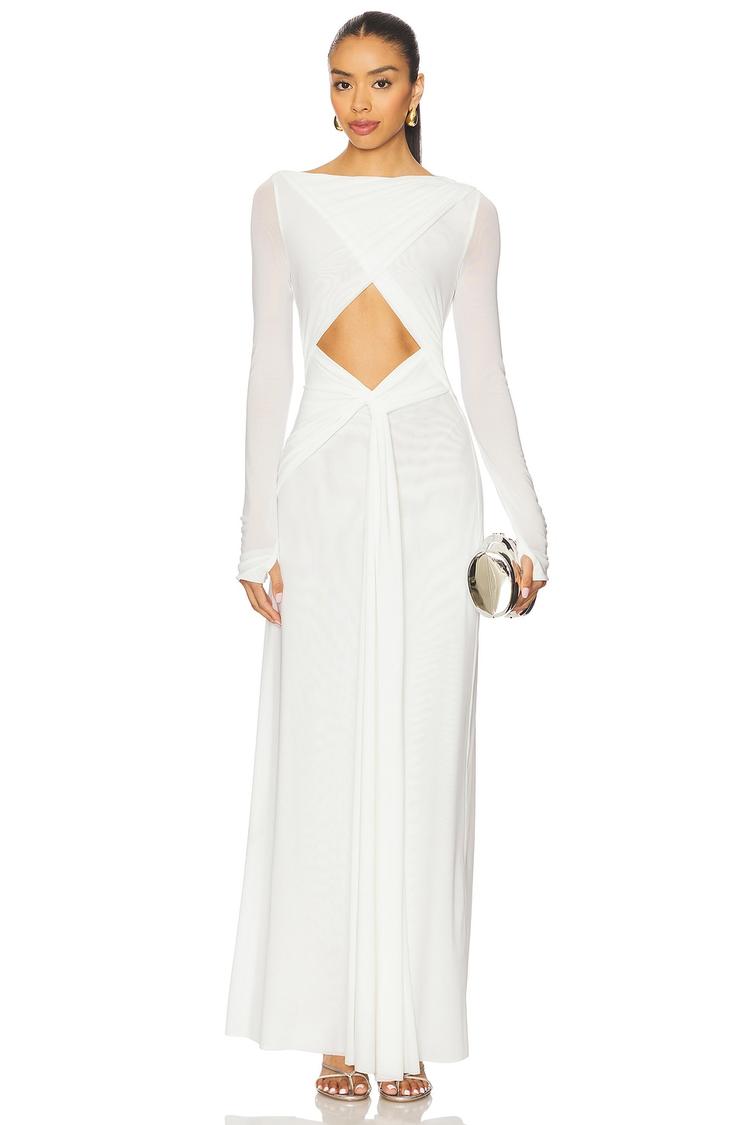 A sophisticated blend of sheer mesh and a sleek column silhouette defines this maxi dress. Featuring a round neckline and long sheer sleeves, it elegantly contours the body with a fitted cut. The standout front cut-out adds a modern, sexy edge to the design. Perfectly suited for cocktail events, date nights, and night outs, this white mesh dress combines elegance and contemporary style with its clean hemline and pull-on slip-on comfort, making it an effortless choice for all-weather wear.