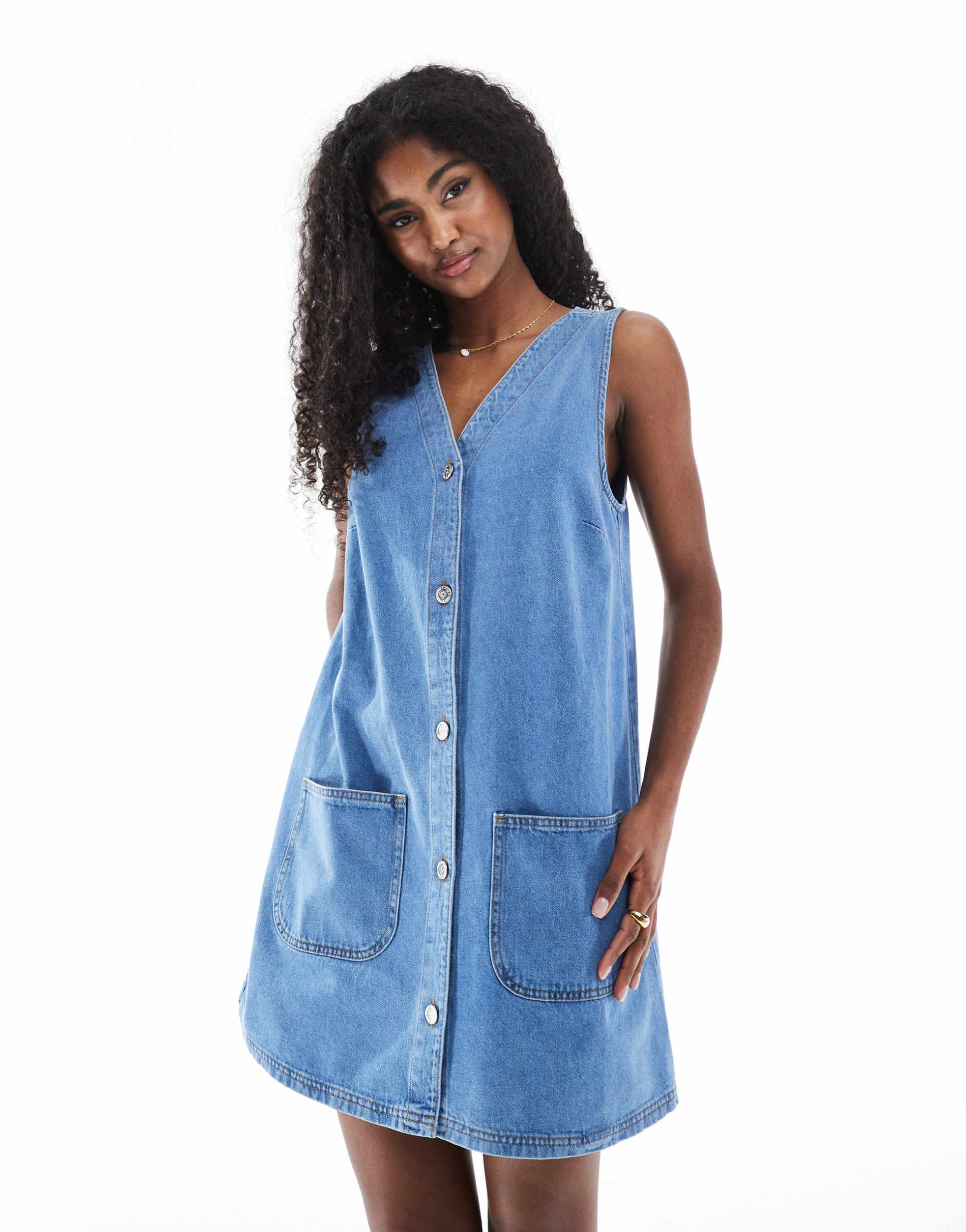 Light-blue matte denim shapes a sleeveless pinafore dress with a flattering V-neck and front button closure. Its regular fit and mini length combine for easy movement, while front patch pockets add casual practicality. Crafted from 100% cotton denim, this dress is perfect for spring and summer days, making it a versatile choice for casual outings, everyday wear, or brunch dates. The clean hemline and classic style ensure effortless chic vibes in a comfortable, laid-back silhouette.