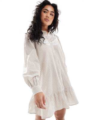 Soft cotton fabric and a classic shirt dress silhouette combine in this mini-length piece featuring subtle beige stripes across an off-white base. The regular fit and long cuffed sleeves offer comfortable everyday wear, while delicate white lace trims on the collar and front add a touch of feminine charm. The button placket and spread collar enhance its timeless appeal. Ideal for casual outings, brunch dates, and relaxed spring or summer days, this dress brings effortless style and versatility to your wardrobe.