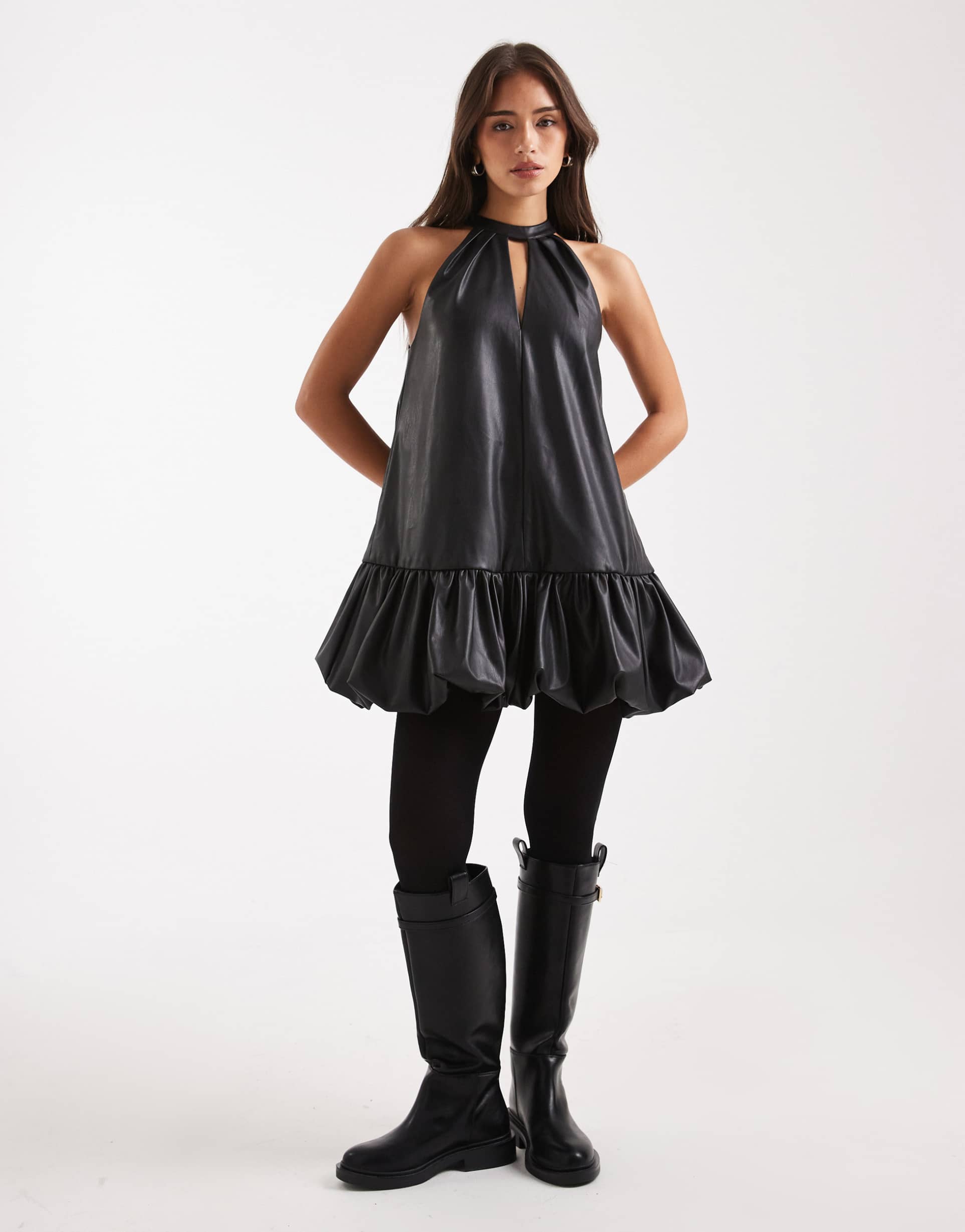 A matte black faux leather mini dress with a playful bubble hem and halter neckline creates a bold, modern silhouette. The keyhole cut-out at the front and button-keyhole back add a flirty touch, while the sleeveless design enhances its edgy appeal. Crafted from smooth polyester with a coating finish, this regular fit dress is perfect for night outs, date nights, or girls' nights. Its versatile style balances sexy and trendy effortlessly, making it a standout piece for your evening wardrobe.