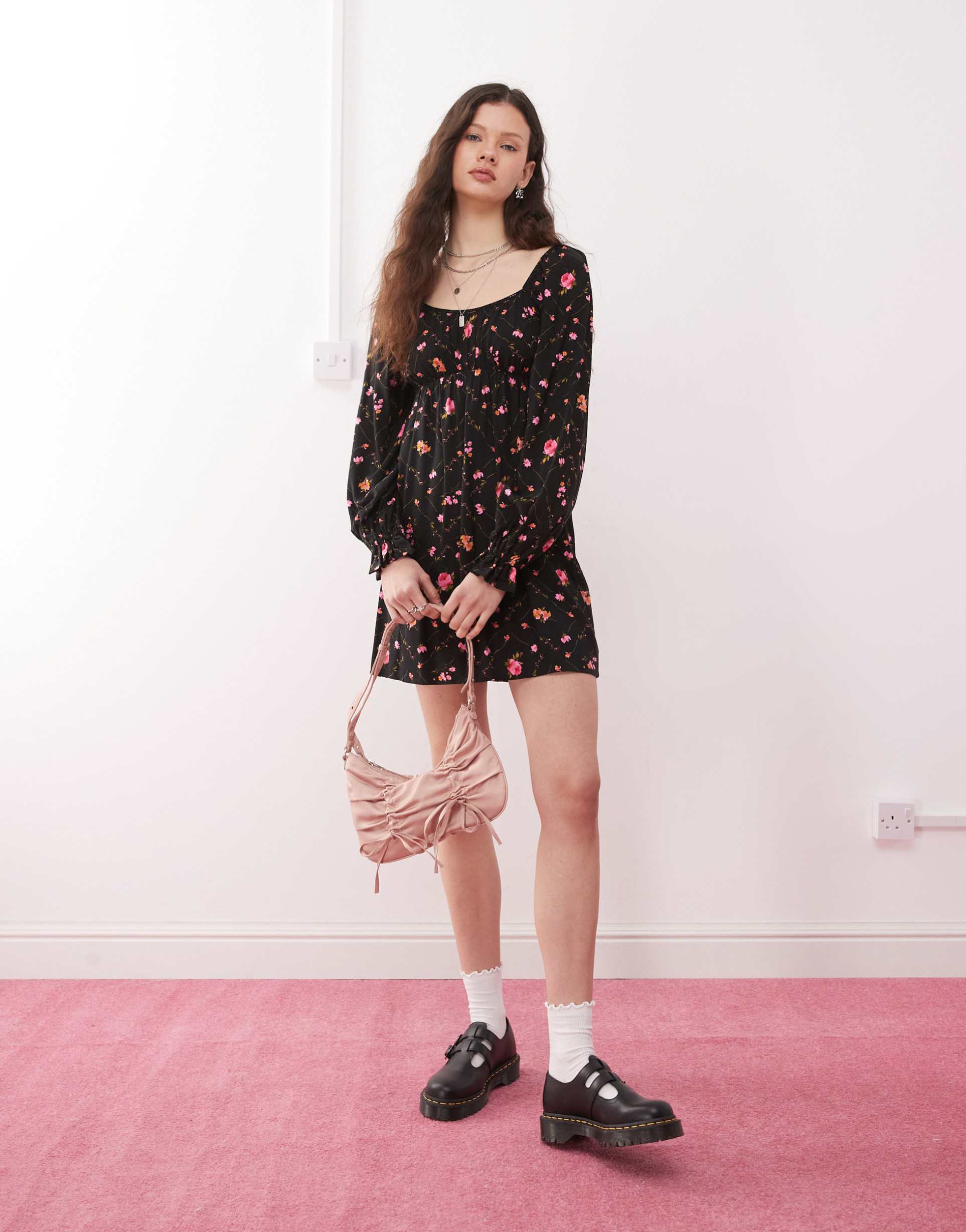 Lightweight viscose fabric with a ditsy floral print brings delicate charm to this black mini shift dress. The square neckline and long sleeves balance the playful mini length, while a shirred stretch panel at the back adds subtle smocking detail and an open back silhouette. With its regular fit and clean hemline, this dress is perfect for casual brunches, date nights, or weekend outings in spring through autumn. Versatile and effortlessly feminine, it pairs beautifully with both flats and heels for a polished yet relaxed look.