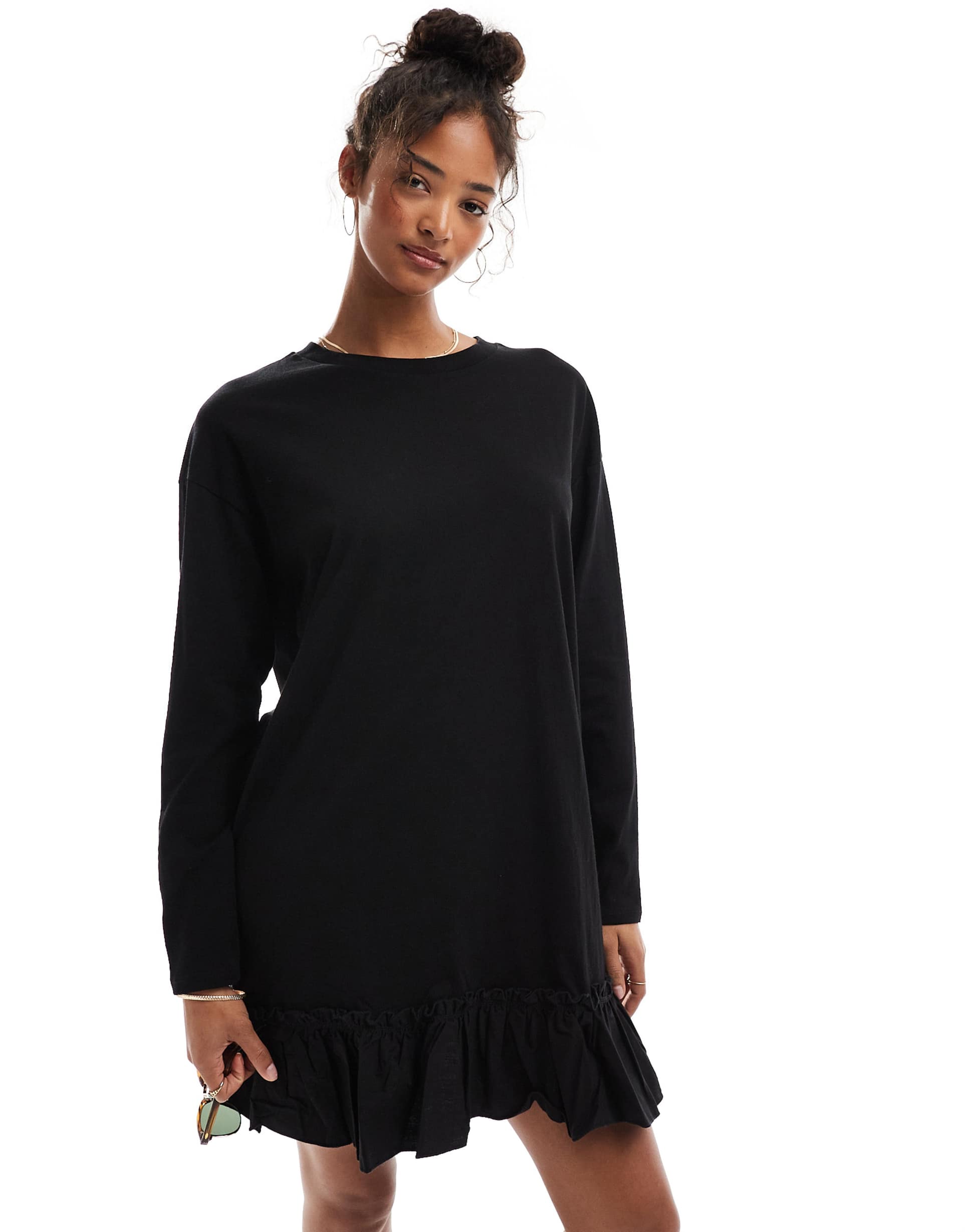 MISS SELFRIDGE LONG SLEEVE POPLIN RUFFLE DETAIL T-SHIRT DRESS IN BLACK