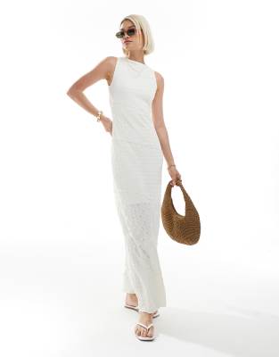 Soft jersey fabric with a mixed texture creates a sleek column silhouette in this cream maxi dress. Featuring a classic crew neckline and sleeveless design, it offers a regular fit that skims the body elegantly. The open back with a delicate tie-up fastening adds a subtle touch of allure. Perfect for spring and summer, this minimalist dress suits casual outings, brunches, date nights, and vacation days with ease.