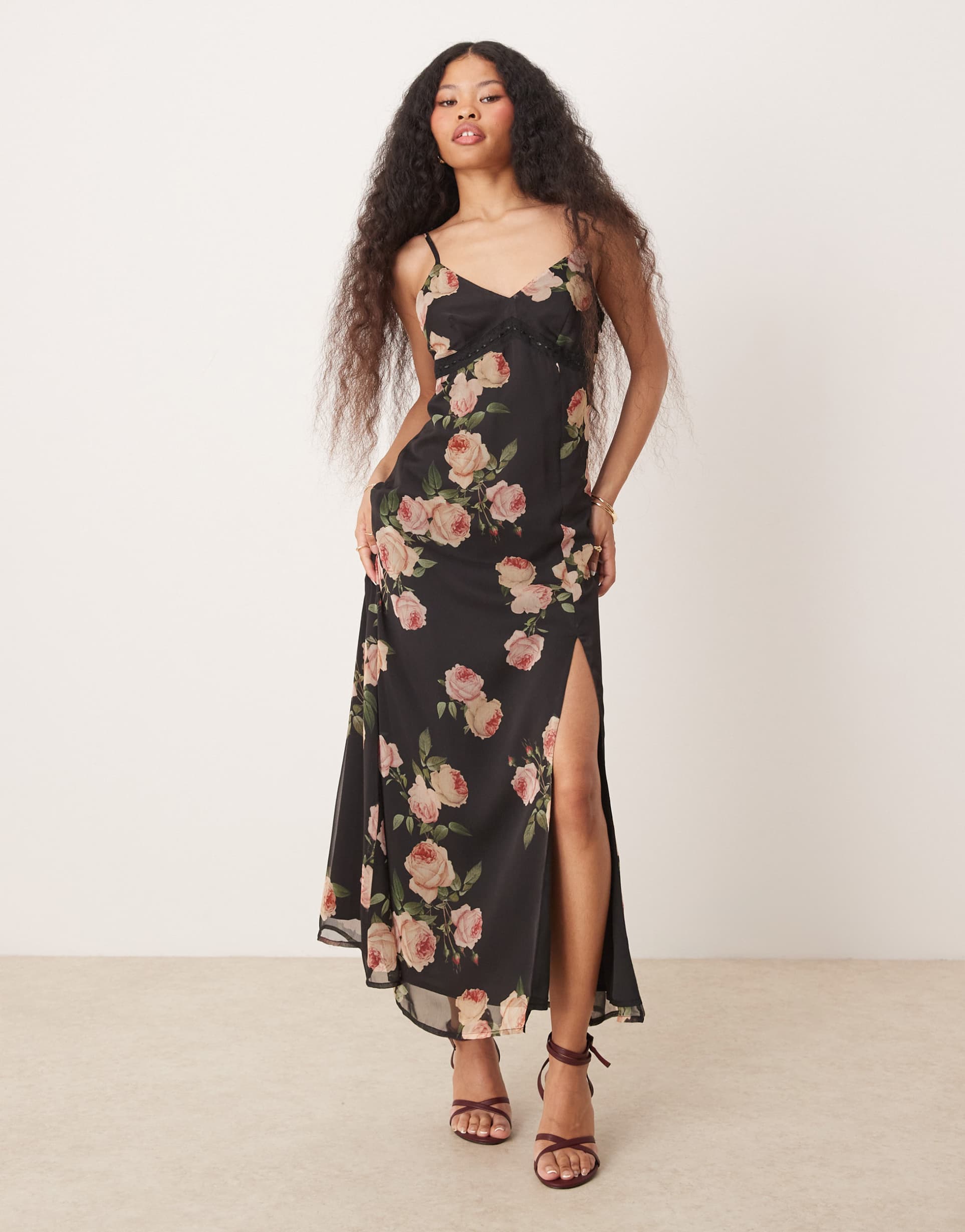 MISS SELFRIDGE PETITE CHIFFON LACE TRIM MAXI SLIP DRESS IN OVERSIZED ROSE PRINT