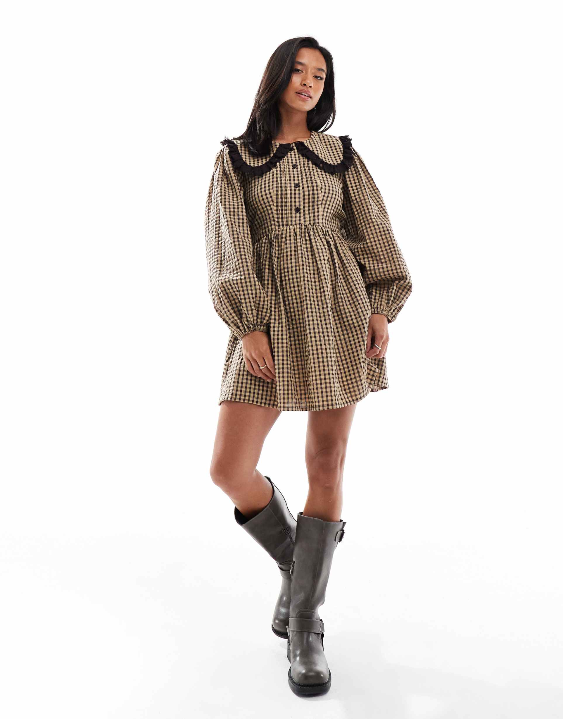 Soft cotton fabric and an oversized Peter Pan collar define this petite shift dress, featuring a charming checkered pattern in beige and brown hues. The long balloon sleeves add volume and a whimsical touch, while the lace trim on the collar and button placket provides delicate detailing. With a regular fit and stretch back waist, this mini-length dress offers comfort and ease, perfect for casual brunches, everyday wear, or relaxed work environments during spring and autumn seasons.