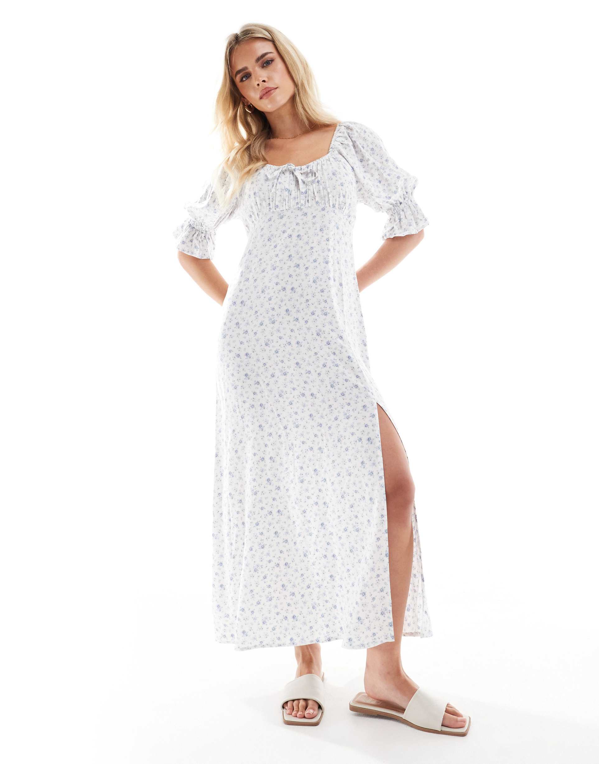 Effortless elegance meets everyday ease in this Miss Selfridge Petite maxi tea dress. Crafted in lightweight viscose that drapes softly, the white base is kissed with a blue floral print for a fresh, romantic silhouette. A scoop neckline and three-quarter sleeves frame the bodice, while a delicate bow at the neckline adds feminine charm. The shawl-like shirred back provides gentle stretch for a comfortable fit, finished with a subtle side slit that moves with you. A versatile pull-on maxi perfect for brunch, vacation days, or warm-weather adventures—style it with sandals or elevate with wedges for a polished, timeless look.