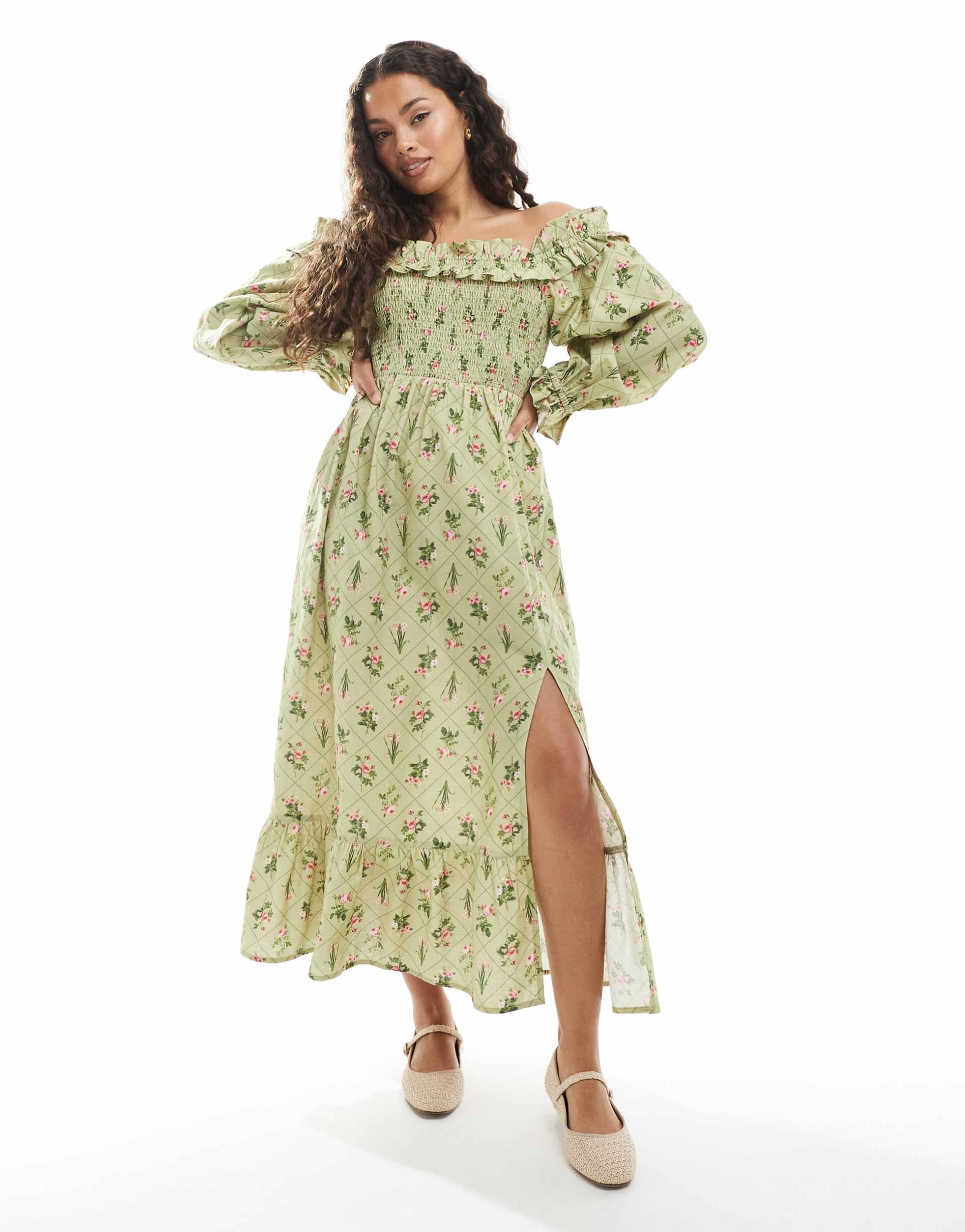 MISS SELFRIDGE PETITE PRINTED LINEN BLEND BARDOT MAXI DRESS IN GREEN FLORAL
