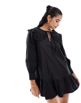 MISS SELFRIDGE POPLIN EYELET COLLAR MINI SMOCK DRESS IN BLACK