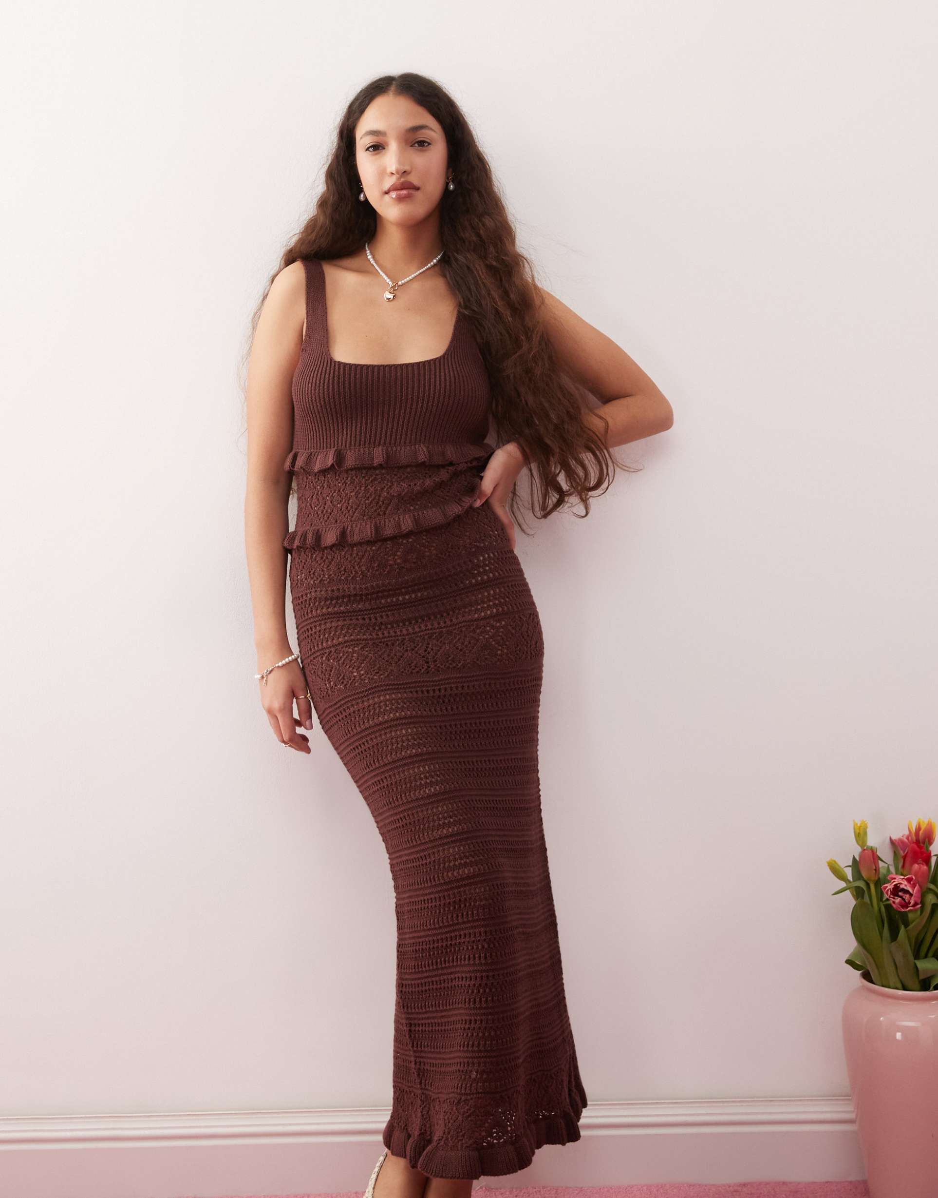 Soft crochet fabric and a figure-flattering column silhouette create a laid-back yet stylish maxi dress in a rich chocolate brown. Featuring a scoop neckline and sleeveless wide straps, this regular-fit dress is adorned with delicate ruffle trims that add charming texture throughout. The clean hemline and handmade crochet look make it perfect for casual spring and summer days, whether you're headed to brunch, a date night, or a relaxed outdoor gathering. Crafted from a comfortable blend of acrylic and cotton, this piece blends bohemian charm with casual chic versatility.