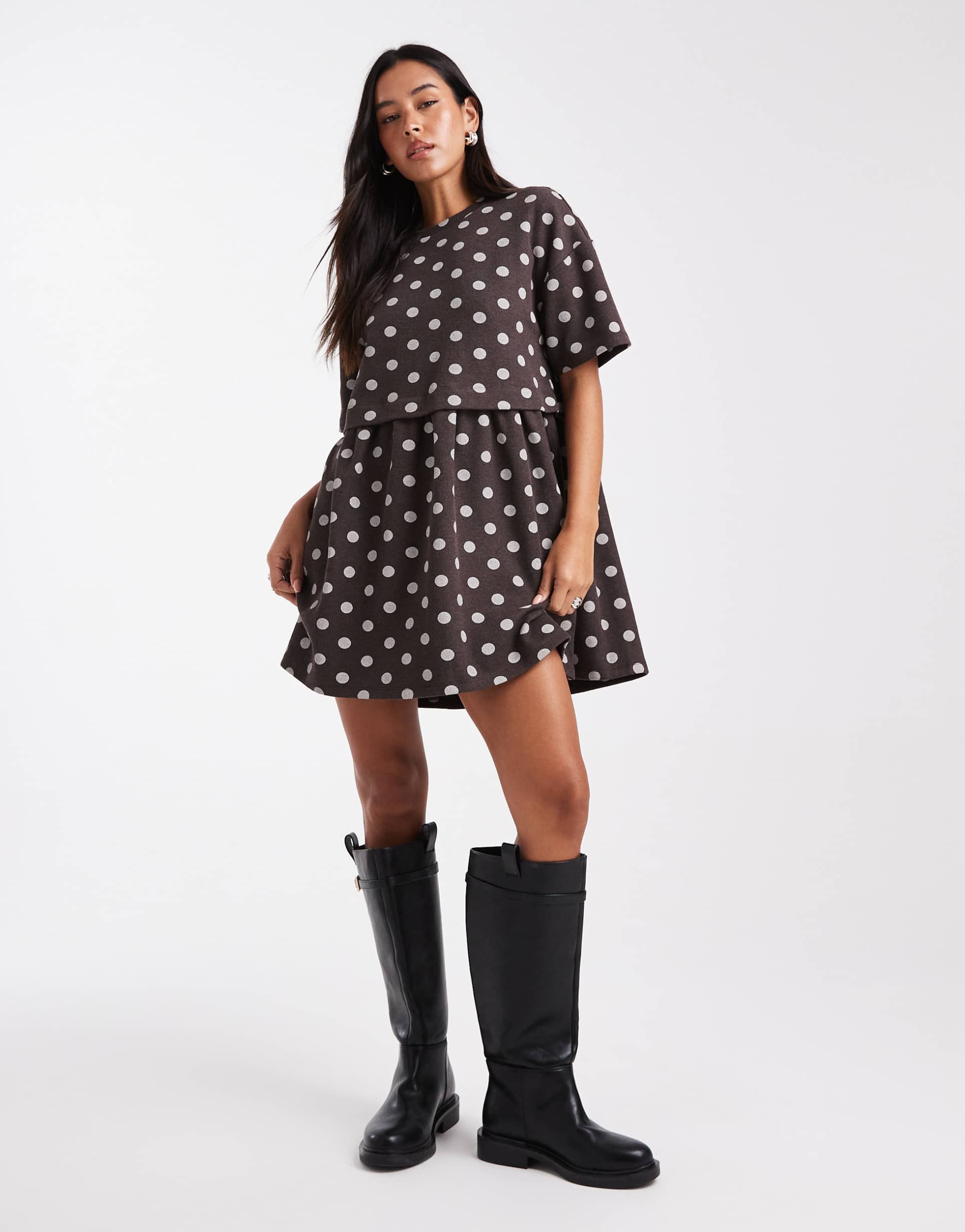 Soft jersey fabric with a comfortable regular fit shapes this chocolate brown smock dress, adorned with an all-over white polka dot print. The mini length and half sleeves create a playful yet practical look, perfect for casual outings, brunch dates, or everyday wear. Featuring a classic crew neck and a layered silhouette, it offers easy slip-on wearability and versatile styling options for spring through autumn seasons.