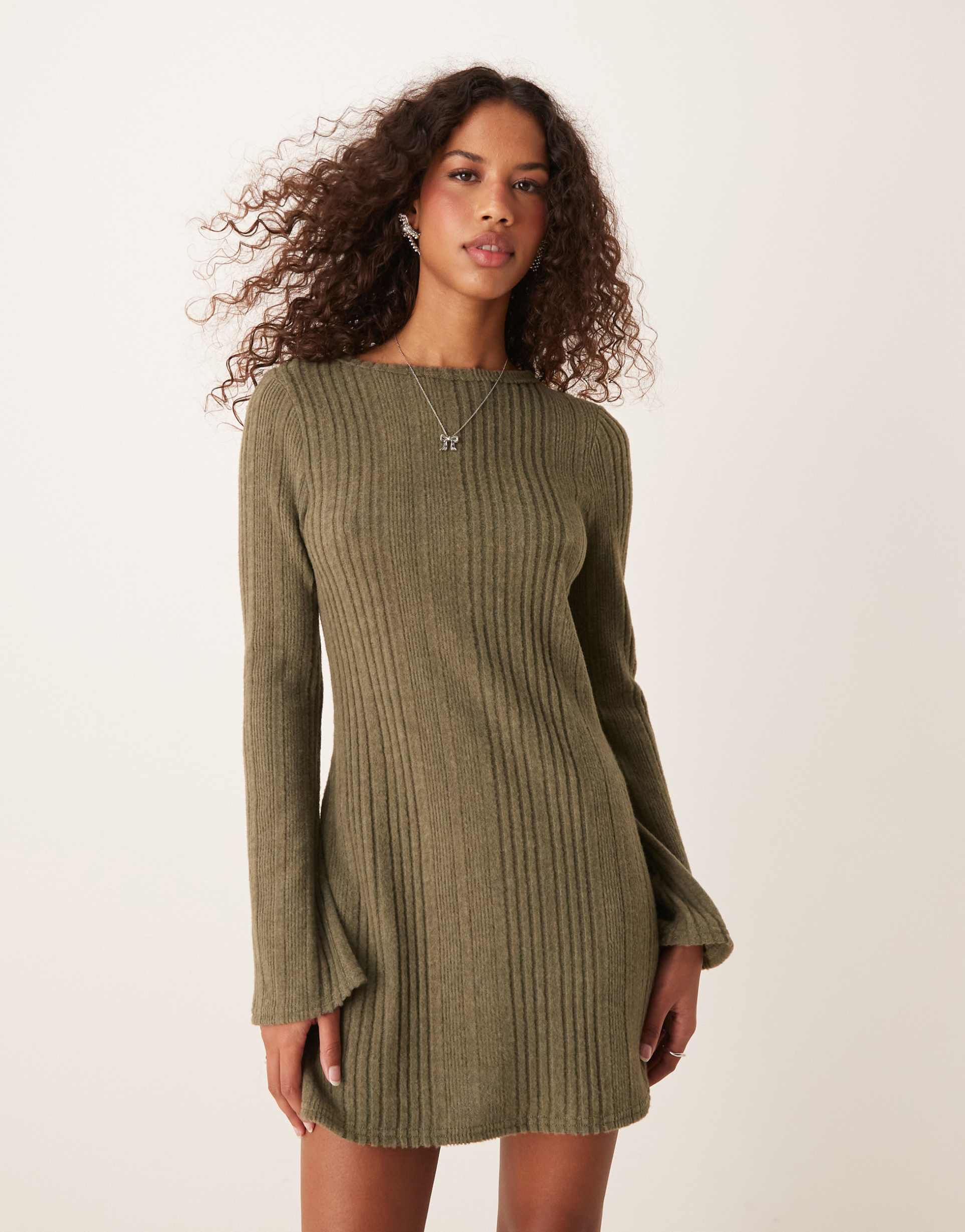 Cozy meets chic in this olive brushed rib knit dress, a wearable weekender essential. The soft, stretchy fabric sculpts a flattering regular fit that flares into a playful mini hem, creating a timeless fit-and-flare silhouette. A high neckline and long sleeves with subtle cuff volume give a refined, minimalist edge perfect for layered autumn mornings or cool evenings. Pullover ease makes it effortless to style with a cardigan, ankle boots, or a sleek belt for a touch of polish. Dress it up with gold jewelry or keep it casual with sneakers—this versatile knit adapts to every mood and moment.